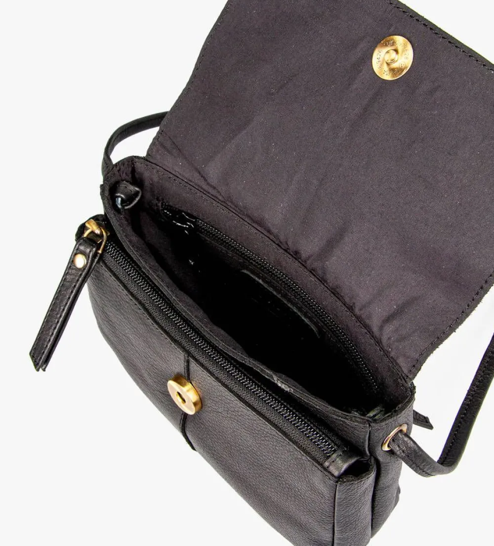 Musta ja ajaton olkalaukku läpällä ja säädettävällä olkahihnalla.Lisää tietojaKiinnitys: Vetoketju/magneettiMa…