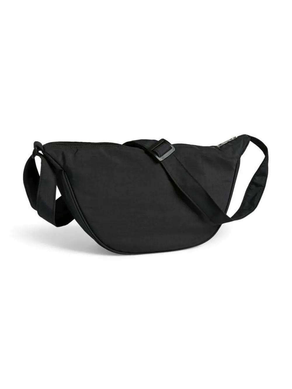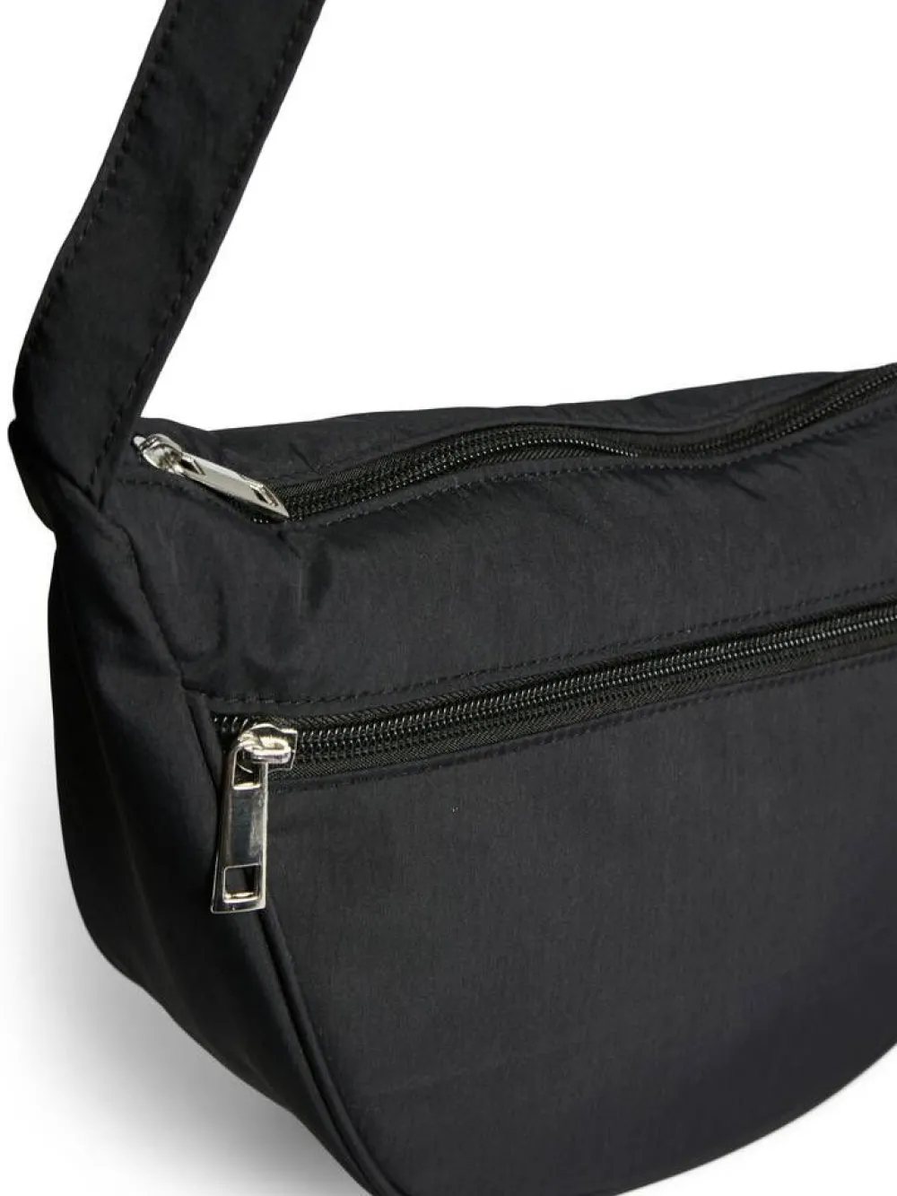 Trendikäs kaarevan muotoinen olkalaukku säädettävällä olkahihnalla. Etupuolella ja laukun sisäpuolella on vetoket…