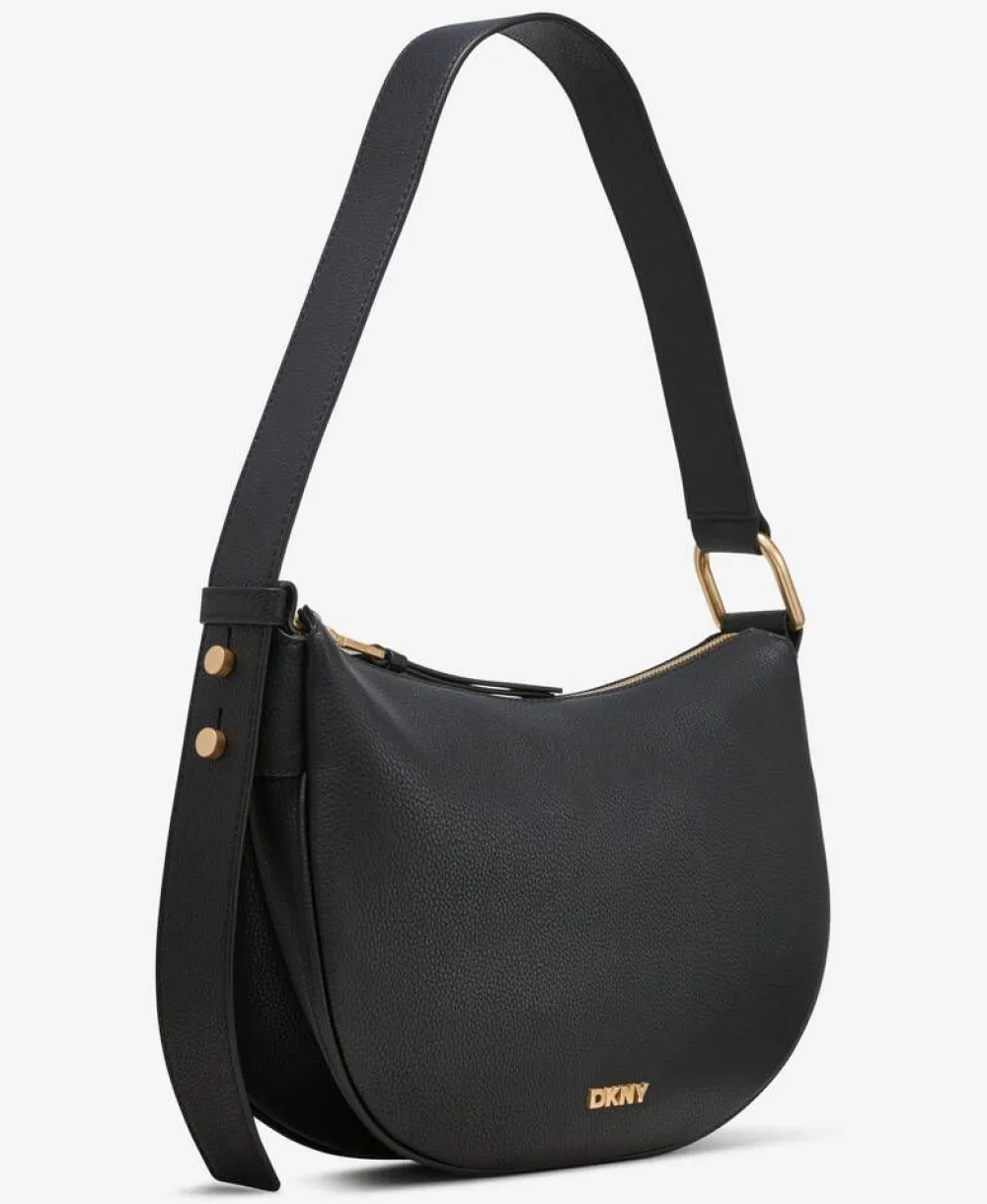 Tilava olkalaukku leveällä olkahihnalla ja vetoketjukiinnityksellä. Edessä on näyttävä DKNY-kirjainlogo.Lisää t…