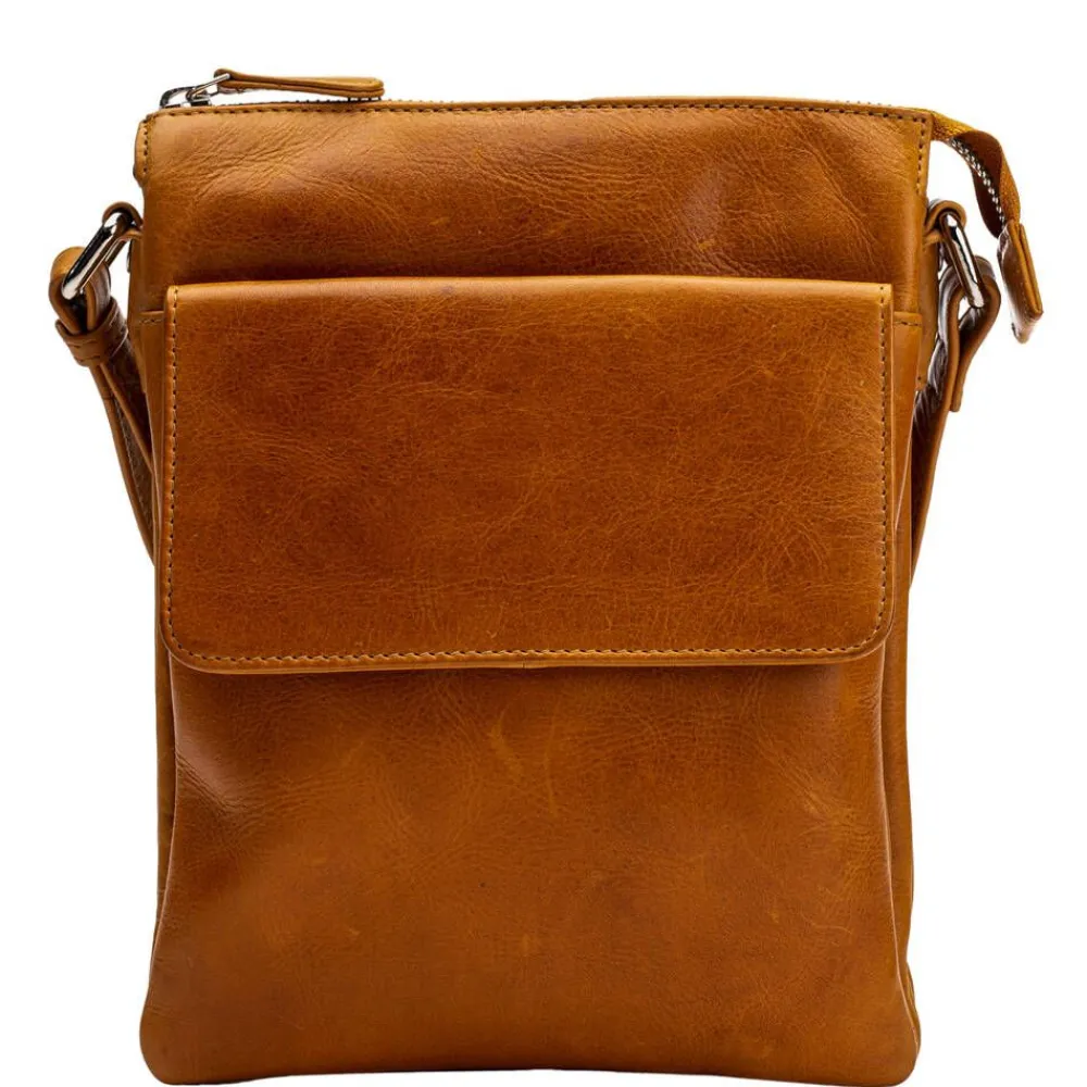 Pystysuuntainen nahkalaukku useilla taskuilla. Etupuolella magneettikiinnitteinen läppätasku ja takapuolella vetoketju…