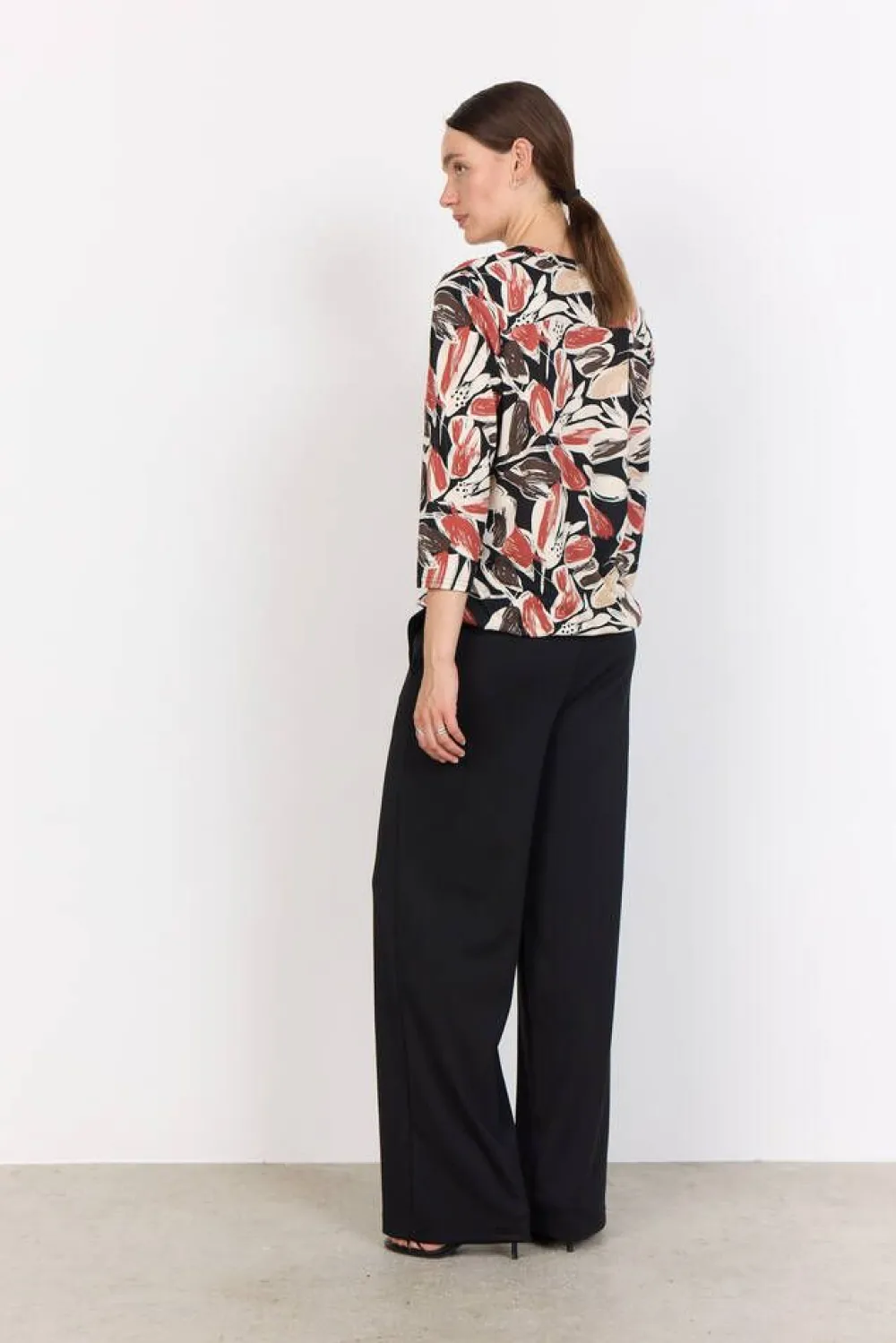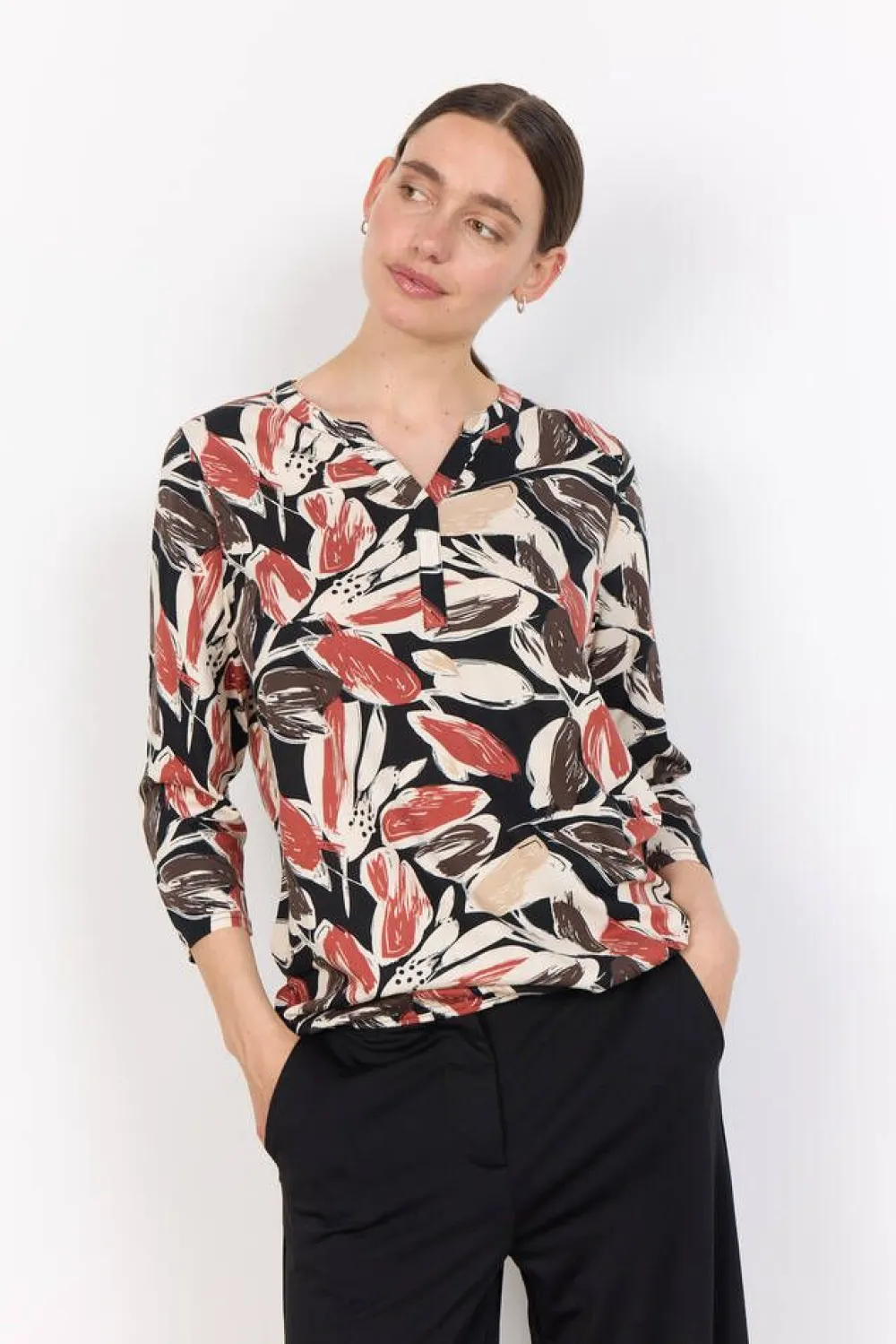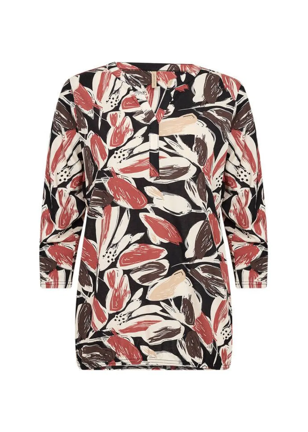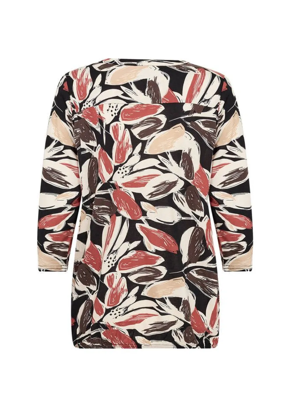 Kaunis kuosillinen trikoopaita pääntien halkiolla ja joustavalla kumpparihelmalla. Vajaamittaiset hihat.Lisää tietoj…