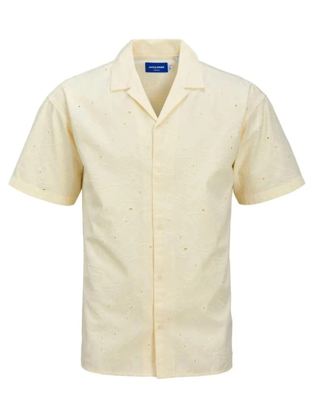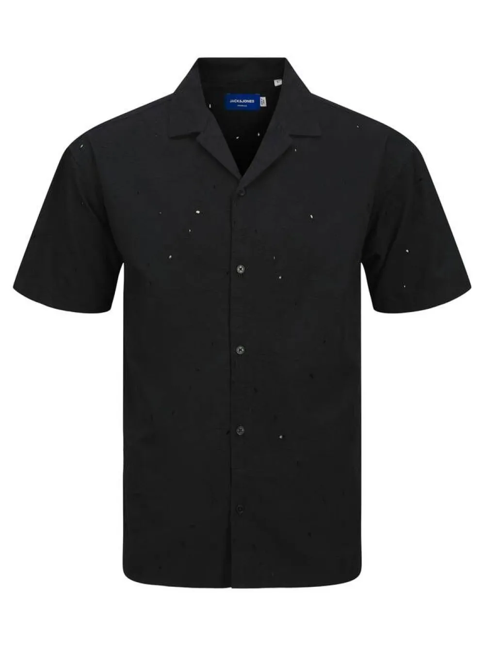 Tyylikäs napillinen paita lyhyillä hihoilla ja taitetulla kauluksella jaquard-kankaasta, jossa on eksoottista kohokuvi…