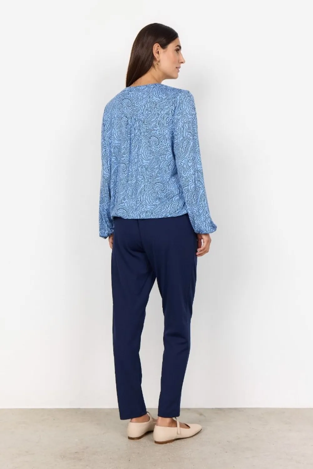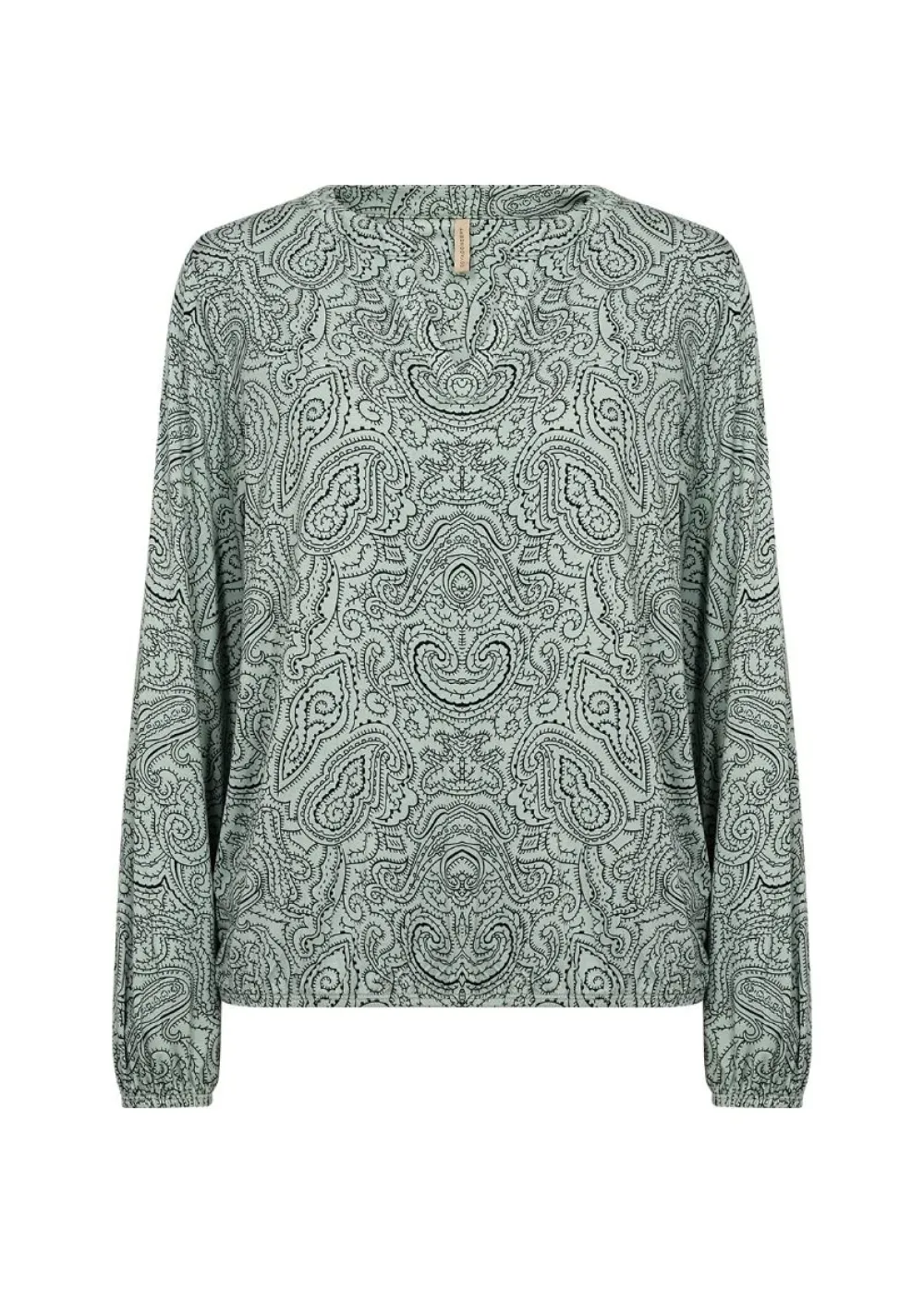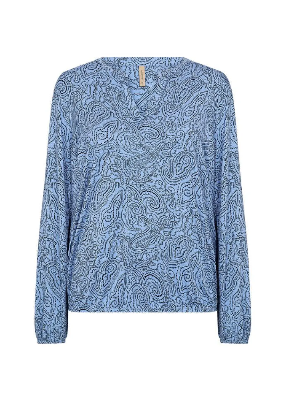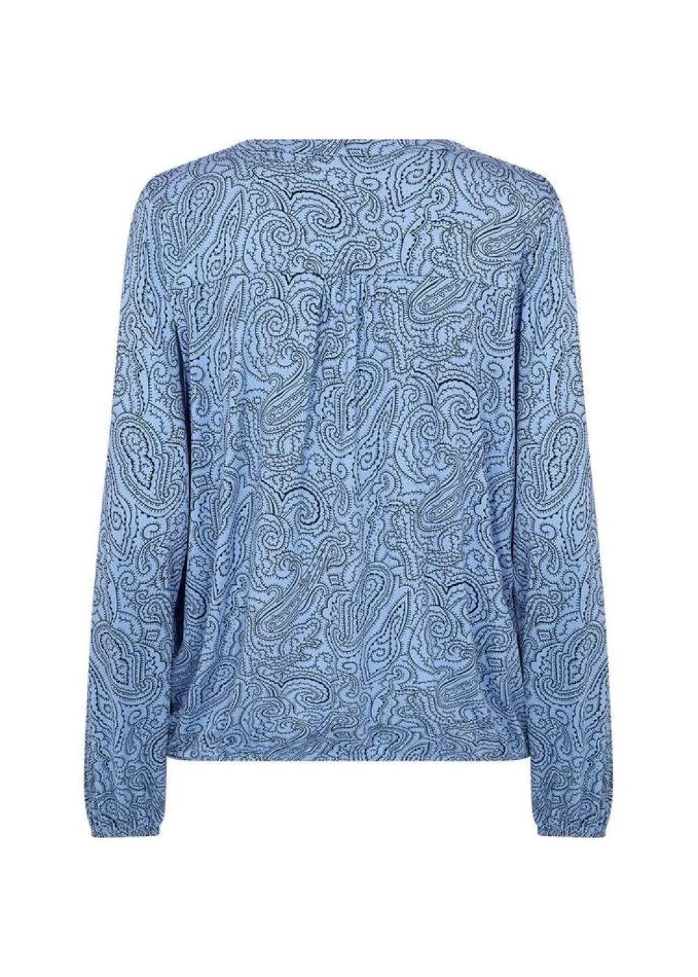 Näyttävä paisley-printillinen pusero klassisella halkiolla pääntiellä. Täyspitkissä hihoissa ja helmassa on jost…