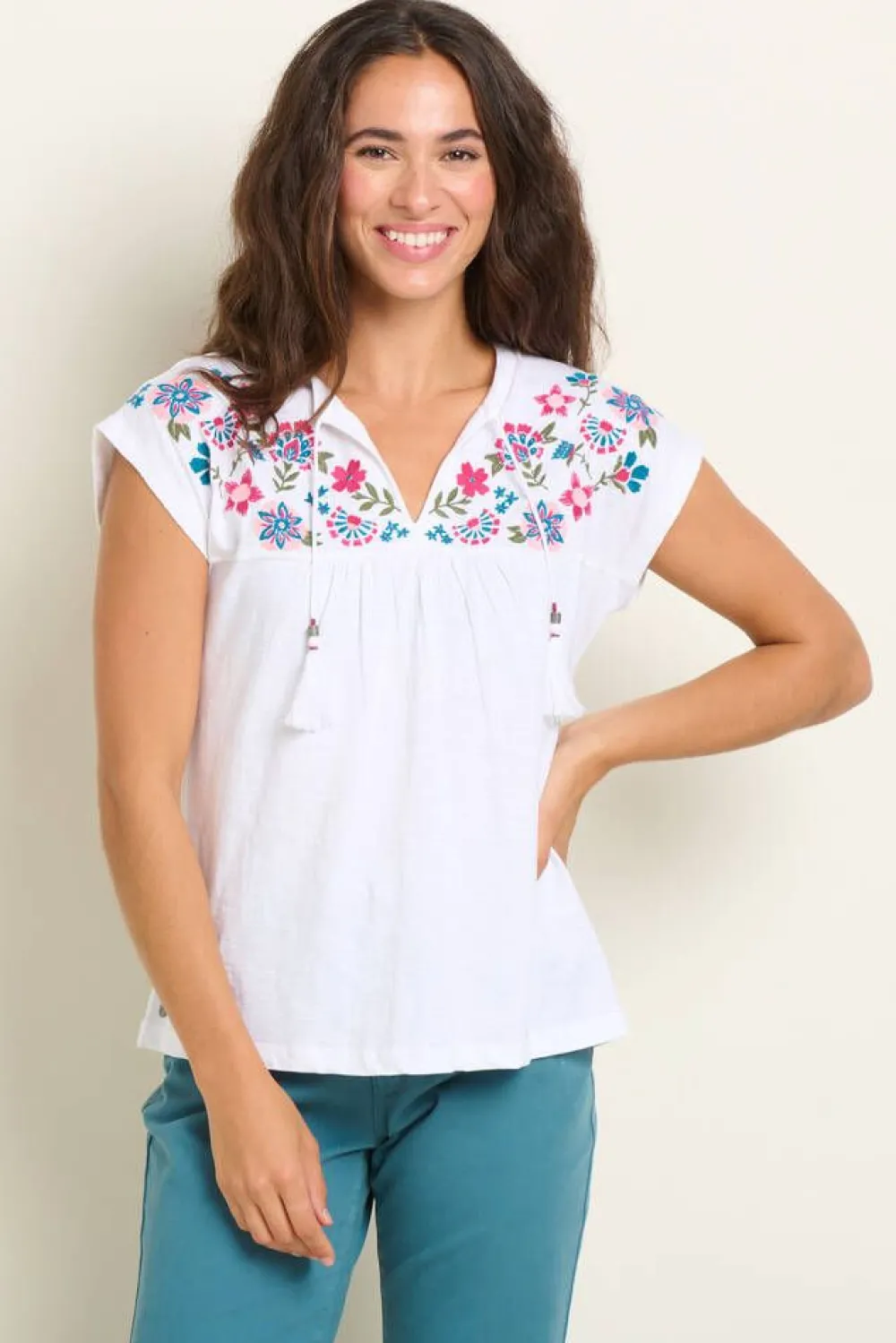 Hihaton paita pääntien tupsukoristeisilla naruilla. Miehustassa on värikäs kukkabrodeeraus.Lisää tietojaHoito-ohje…