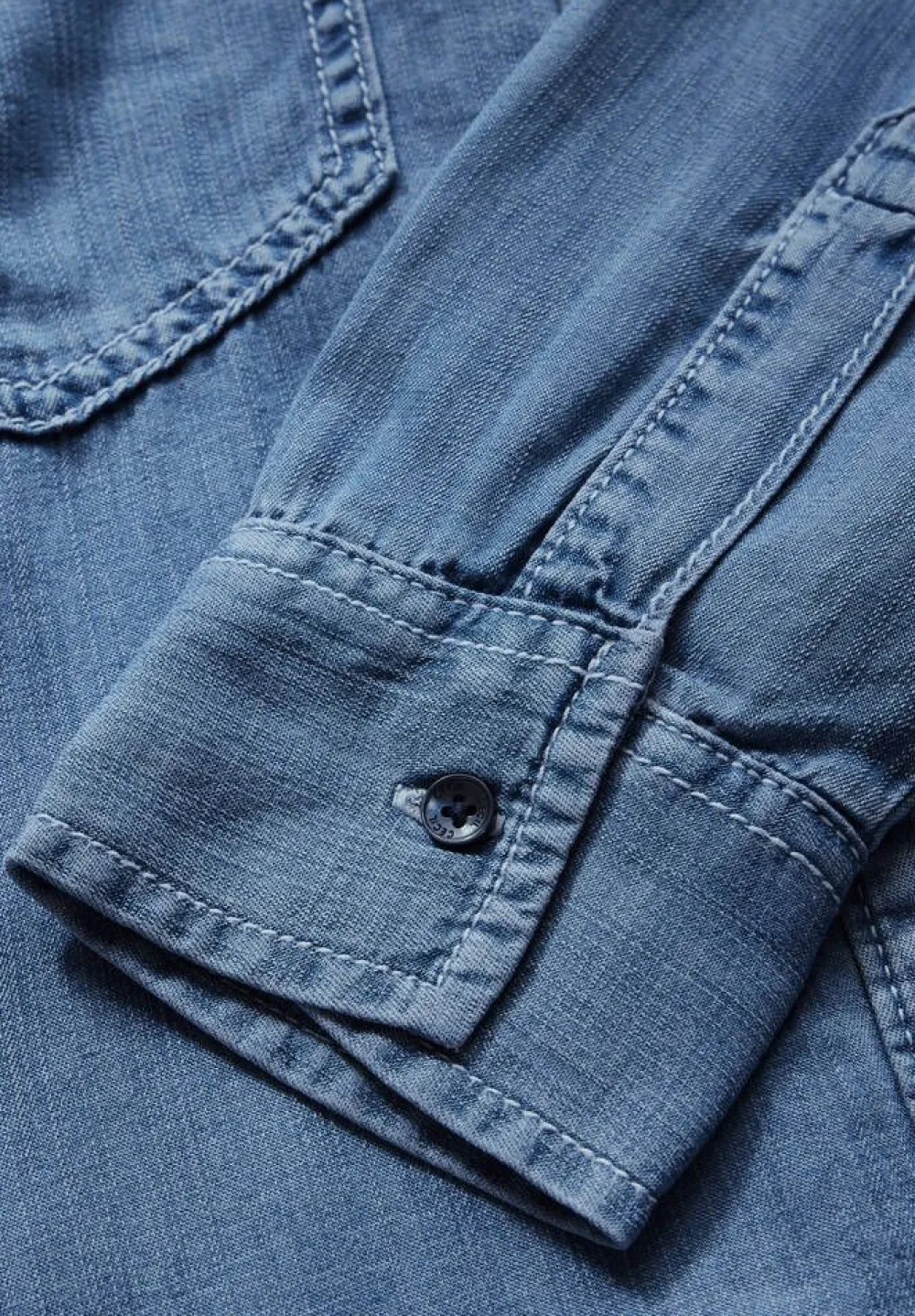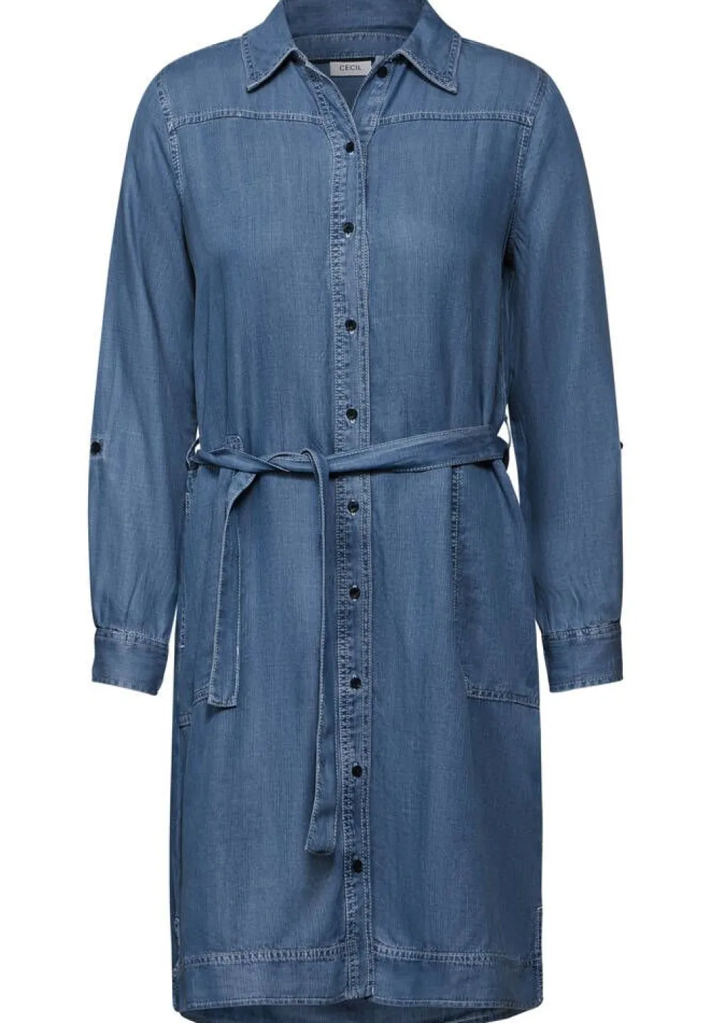 Ajaton ja monikäyttöinen denim-mekko käärittävillä hihoilla ja solmittavalla kangasvyöllä. Hameen helmassa halki…
