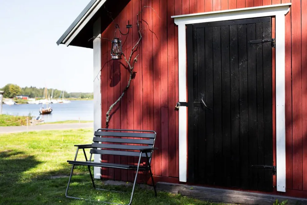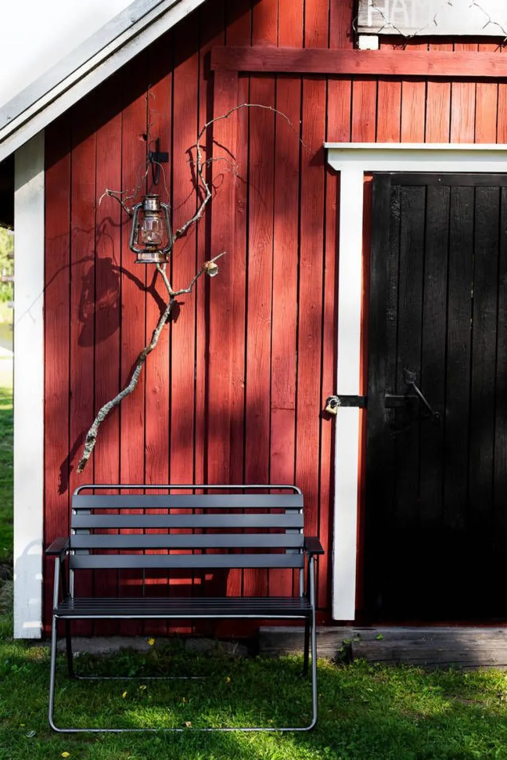 Kotimainen kokoontaitettava kahden istuttava Retro-penkki, jonka runko on valkoiseksi pulverimaalattua terästä ja puuo…