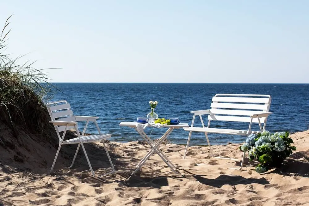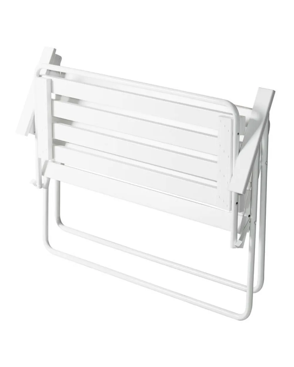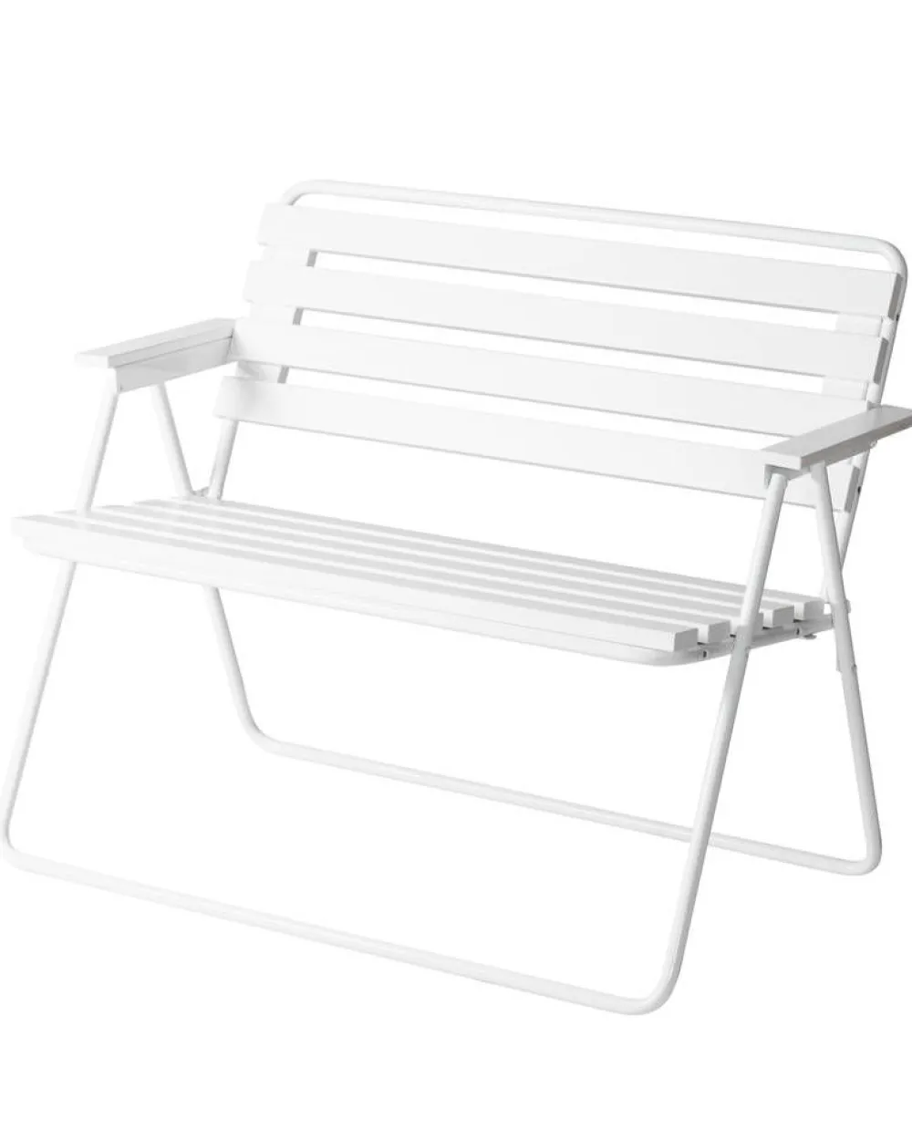 Kotimainen kokoontaitettava kahden istuttava Retro-penkki, jonka runko on valkoiseksi pulverimaalattua terästä ja puuo…