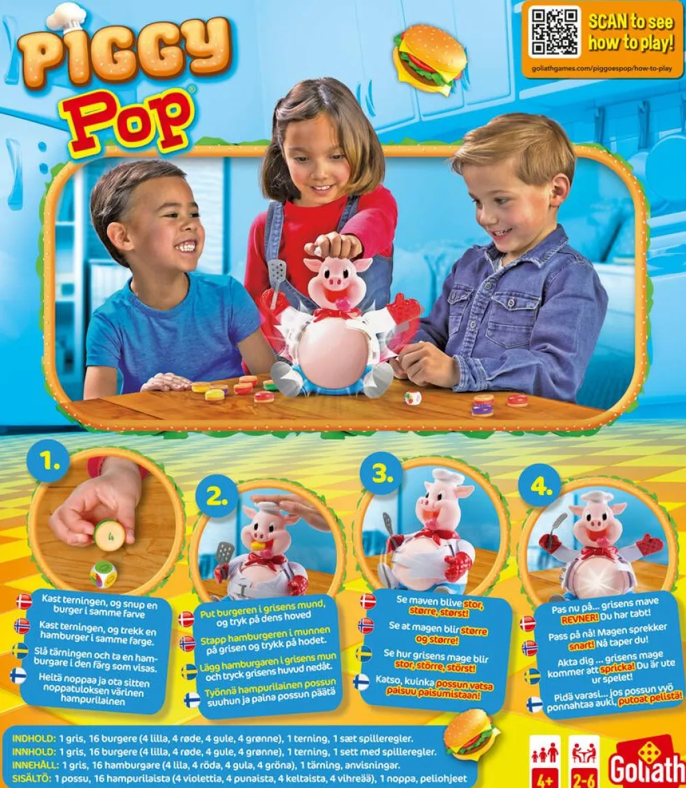 Piggy Pop -peli tarjoaa ratkiriemukkaita hetkiä lapsille. Pelaajat heittävät noppaa ja syöttävät possulle hampuril…