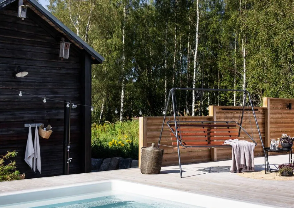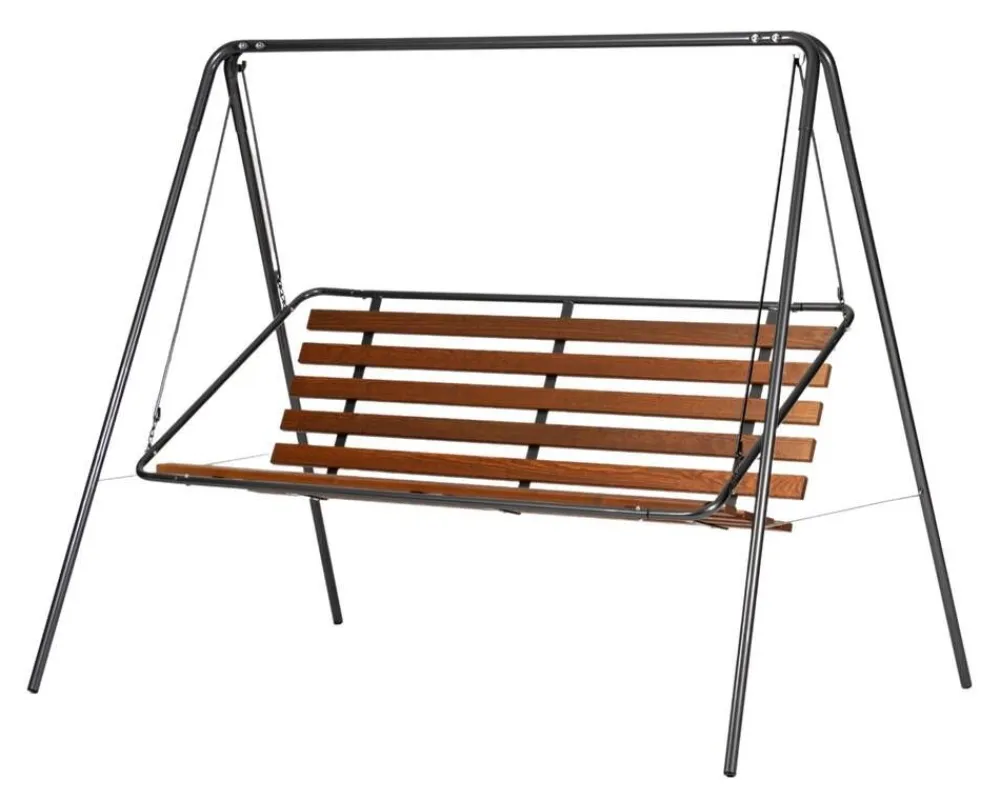 Suvisaari kolmen hengen pihakeinussa on harmaaksi pulverimaalattu teräsputkirunko ja ruskeaksi maalattu mäntypuinen is…