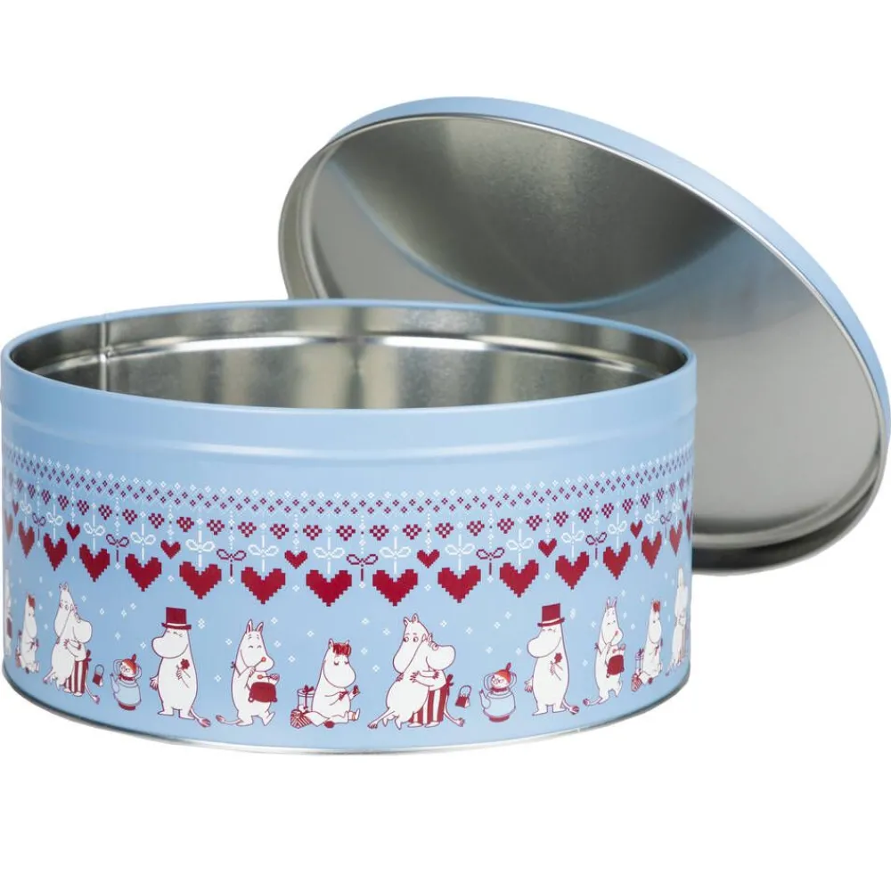 Iso pyöreä peltipurkki, jonka täyteläisen sinipohjaisessa Sydäntalvi-kuosissa Muumit nauttivat hyväntuulisina yhd…