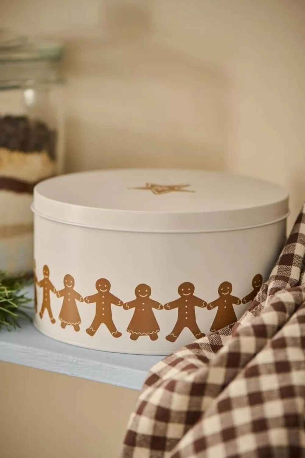 Tämä ihastuttava pyöreä purkki, jota koristavat suloiset piparkakkuhahmot ja kannessa tähdenmuotoinen pipari, tuo j…