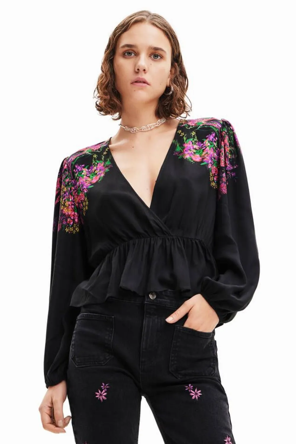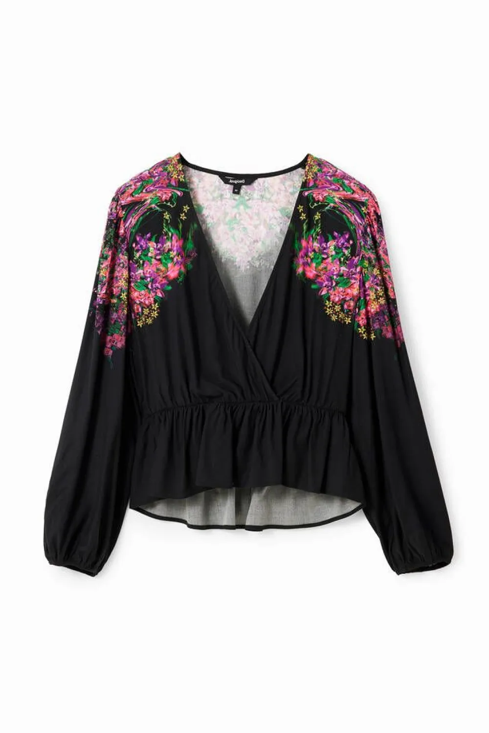 Kietaisumallinen pusero pitkillä hihoilla. Olkapäillä on värikäs kuviointi ja vyötäröllä muotoa antava kuminauh…