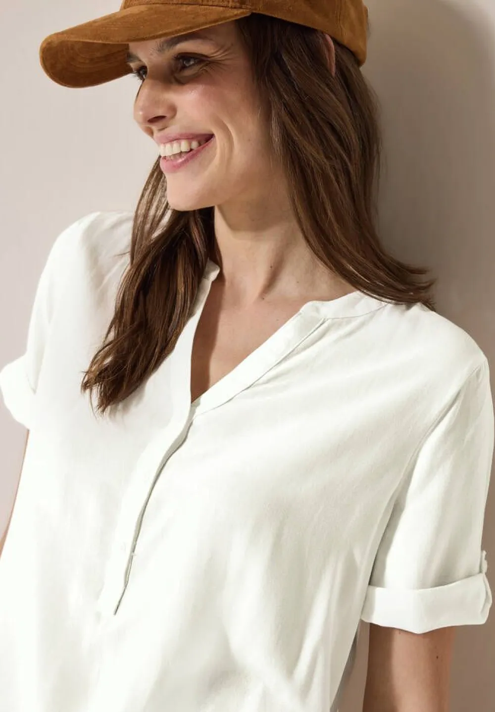 Klassisen tyylikäs pusero puolinapituksella ja lyhyillä käärittävillä hihoilla. Pusero on takaa hieman pidempi.Lis…