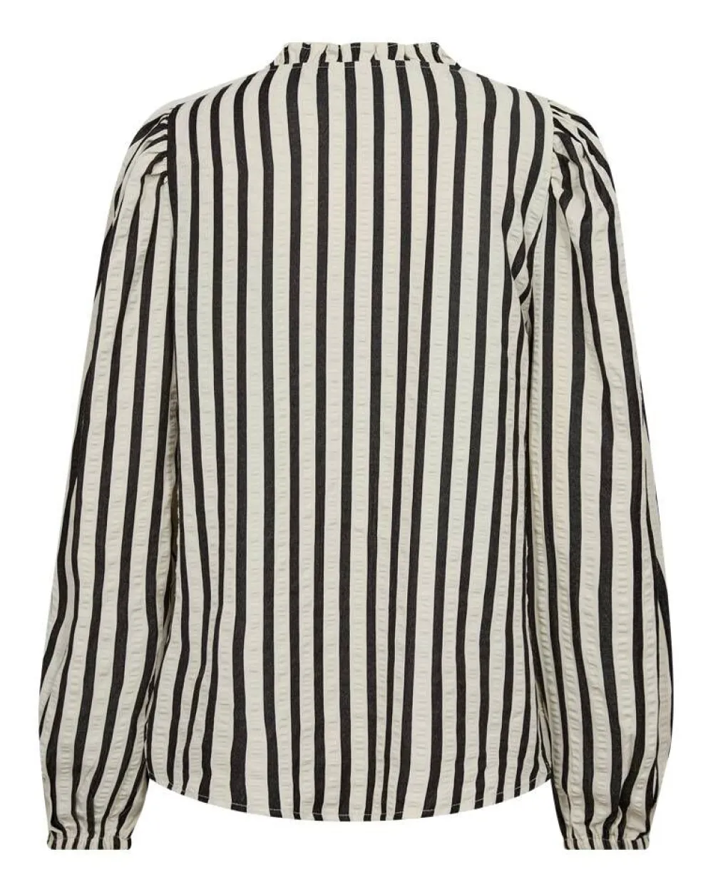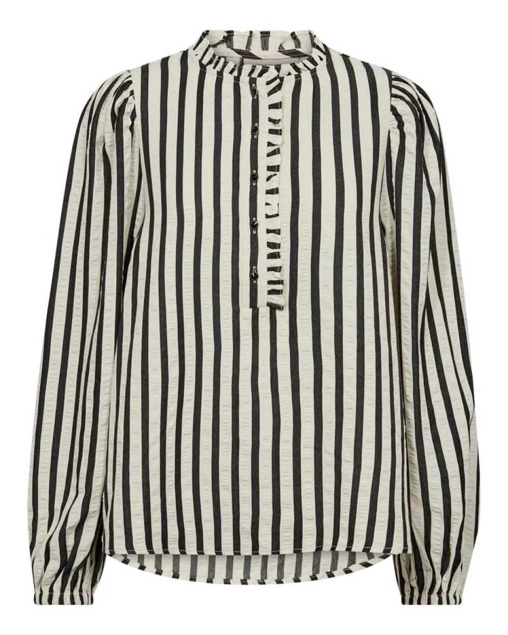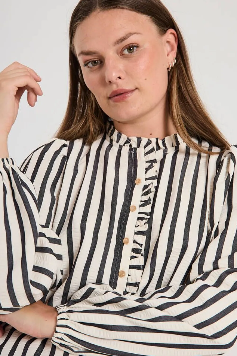 Tyylikäs kevyesti laskeutuva musta-valkoraidallinen pusero, jossa naisellinen frilla pystykauluksessa ja nappilistassa….