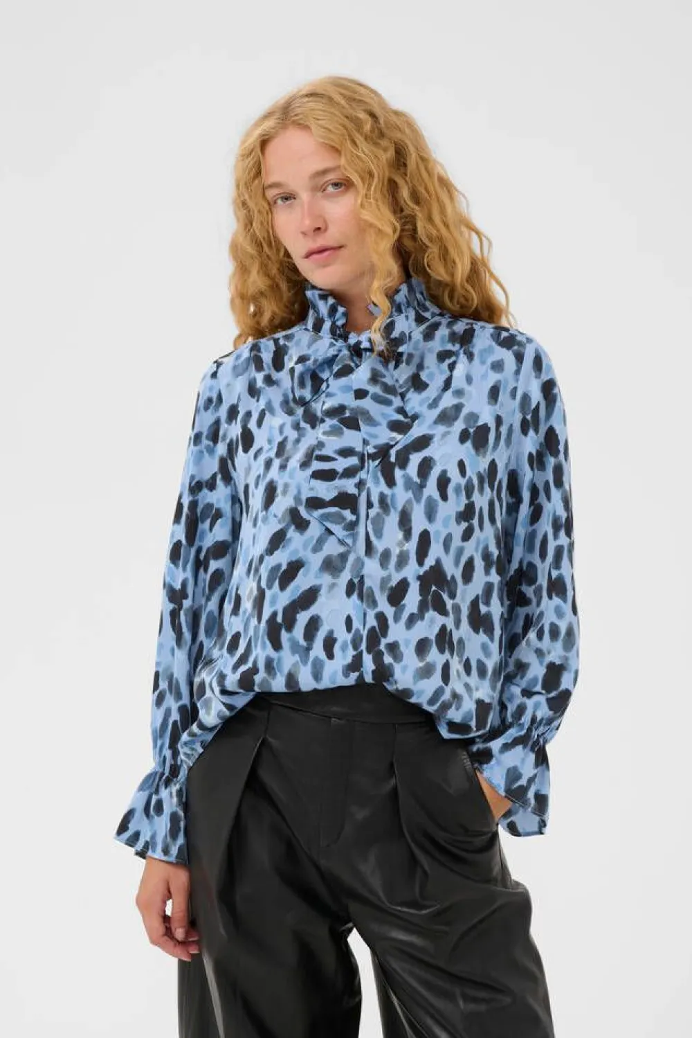 Huipputrendikäs täpläkuosinen pusero frillallisella huivikauluksella ja pitkillä hihoilla, joissa on ranteiden kohda…