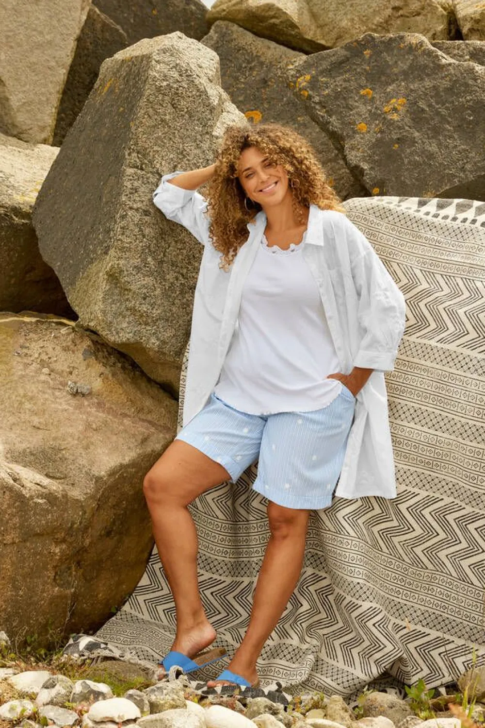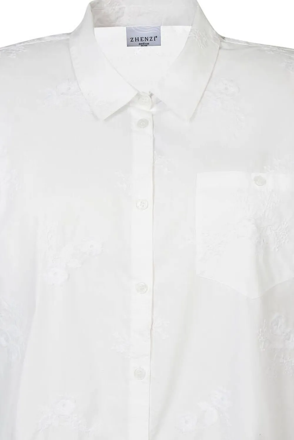 Rento kokovalkoinen pitkä kauluksellinen pusero jacquard-kuosilla. Puserossa 3/4-hihat, etupuolen nappikiinnitys sekä …
