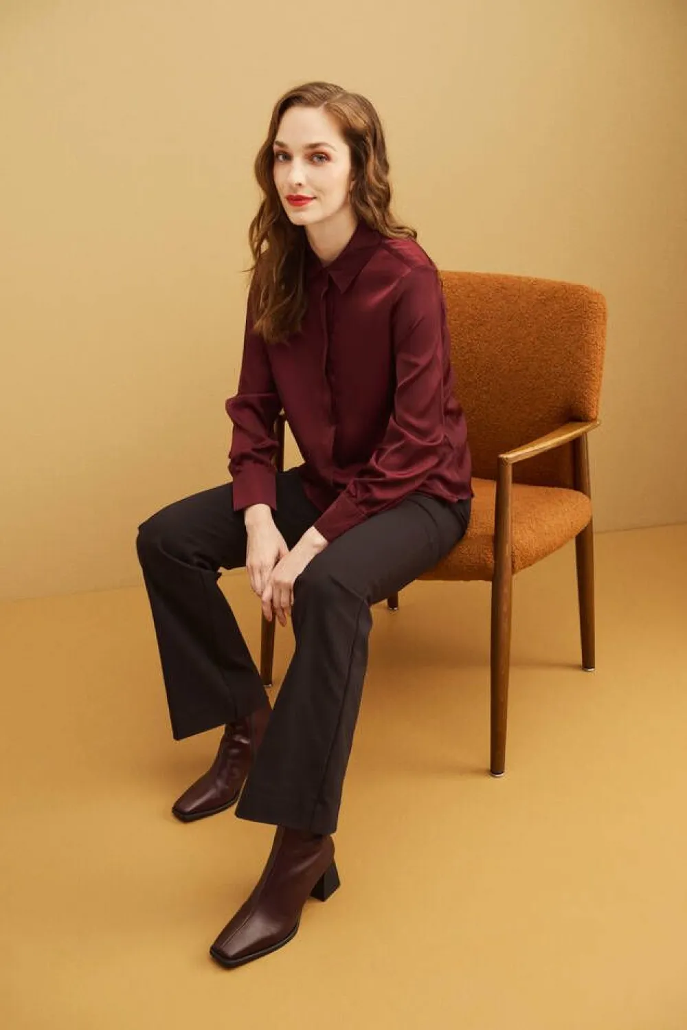 Yksivärinen satiinipusero pitkillä hihoilla ja piilonappikiinnityksellä.Lisää tietojaRinnanympärys (koko 36): 102 …