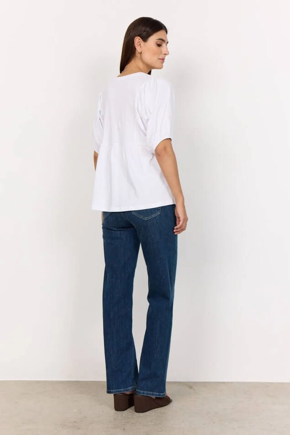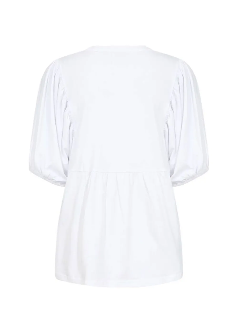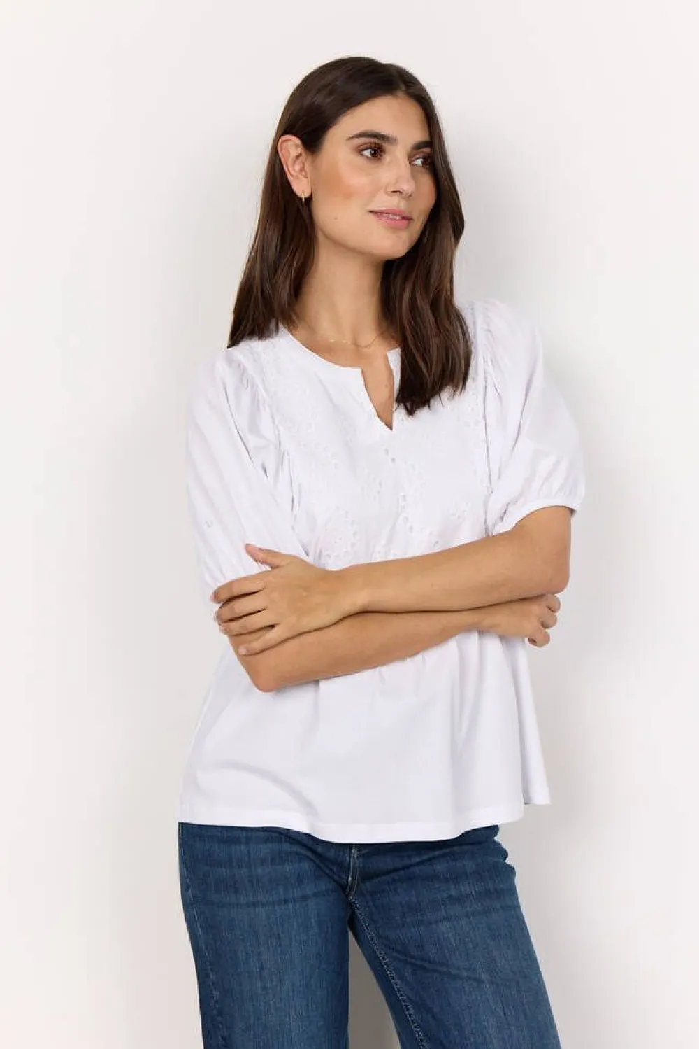 Naisellinen pusero lyhyillä puhvihihoilla ja hieman leventyvällä helmalla. Miehustassa on puuvillapitsiä.Lisää tie…