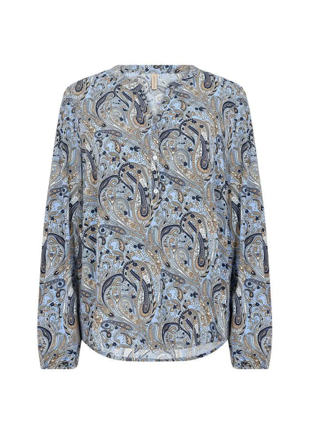 Ajattoman trendikäs paisleykuosinen pusero puolinapituksella ja pitkillä kevyillä hihoilla, joissa on hihansuissa kum…