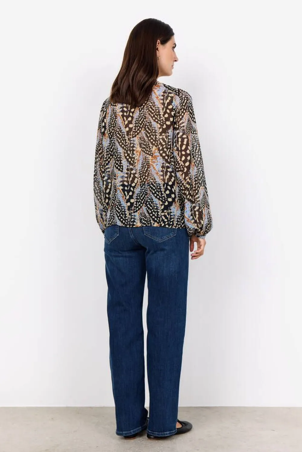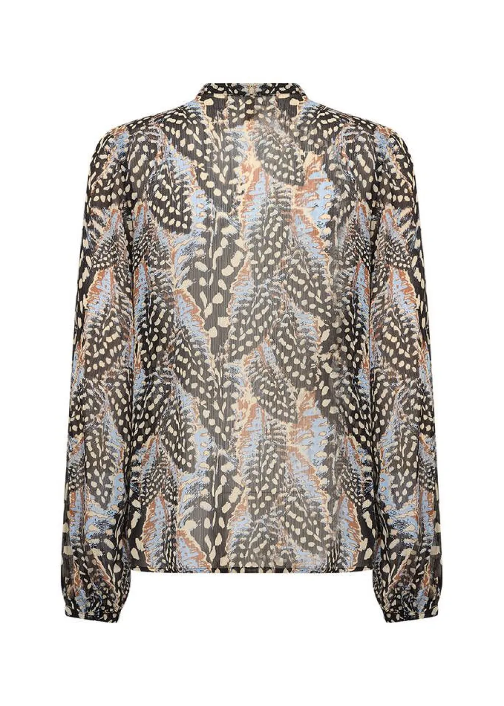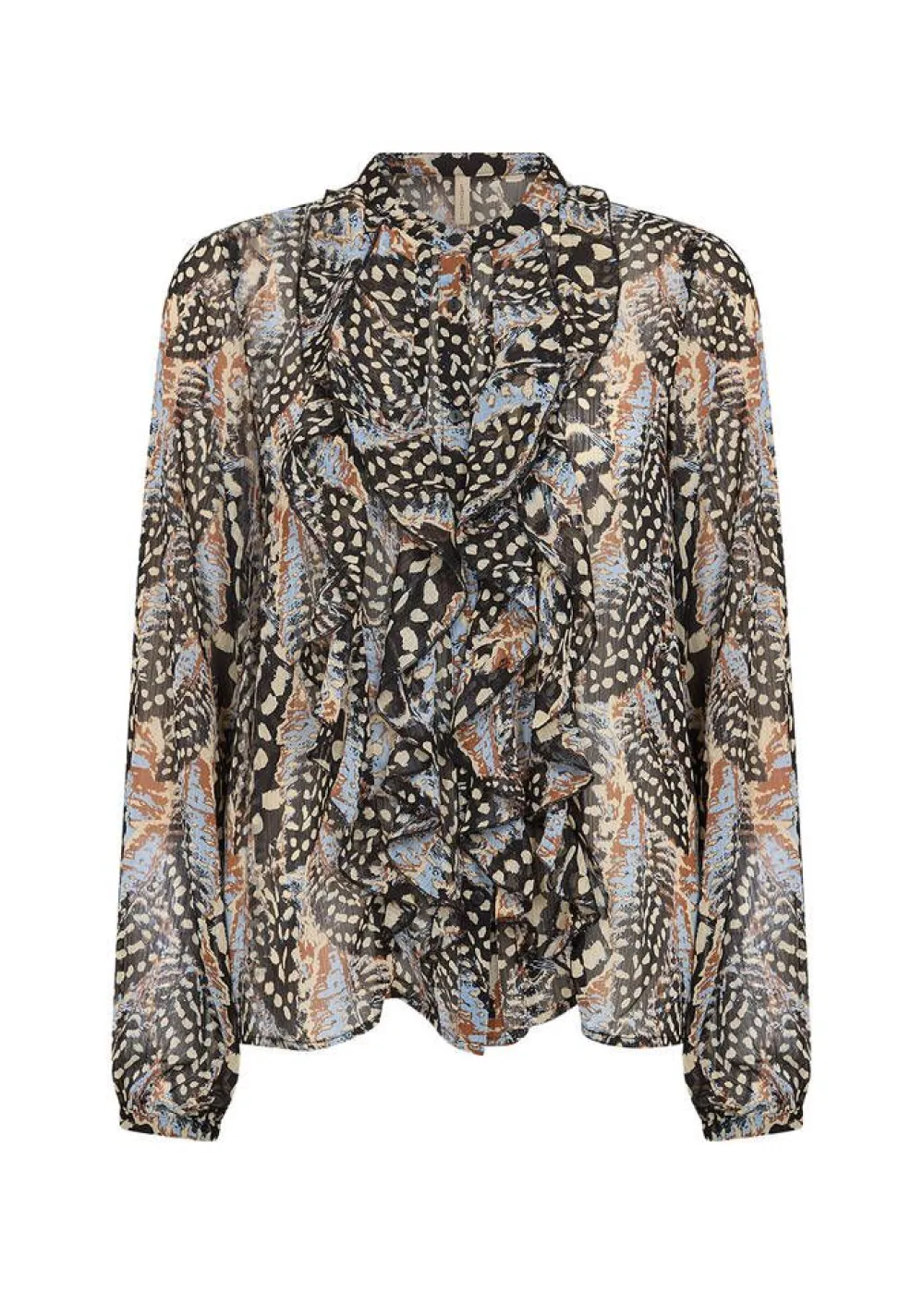Naisellinen pitkähihainen kirjava printtipusero läpikuultavaa materiaalia. Edessä näyttävät röyhelöt ja nappikii…