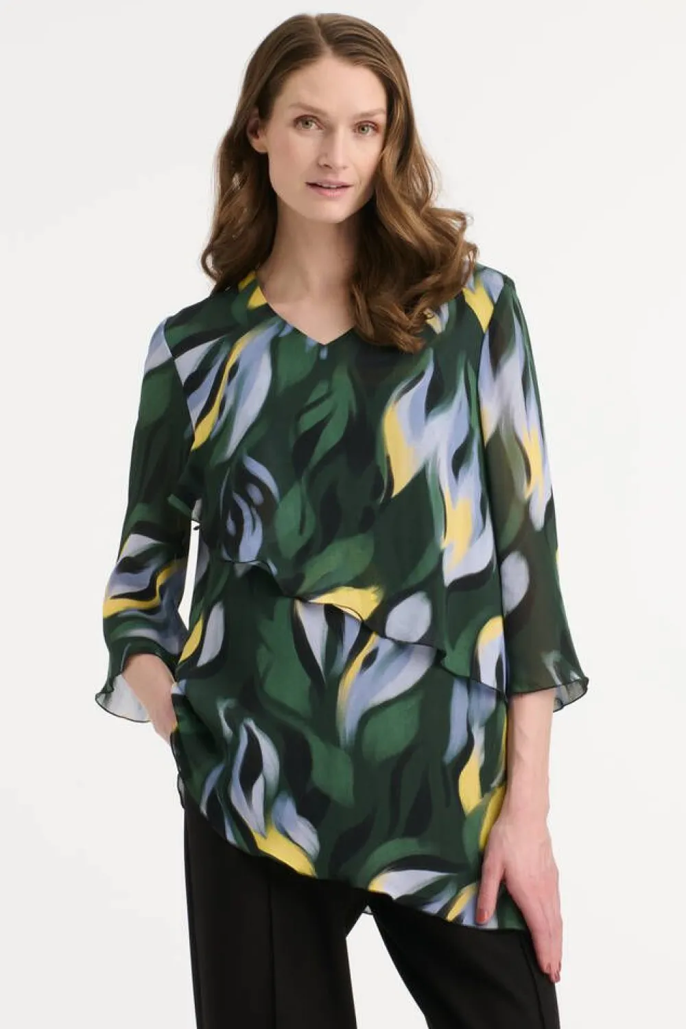 Kaunis läpikuultava kevyt harsomainen pusero värikkäällä printillä. Puserossa on vino kerroshelma ja 3/4 hihat.Lis…