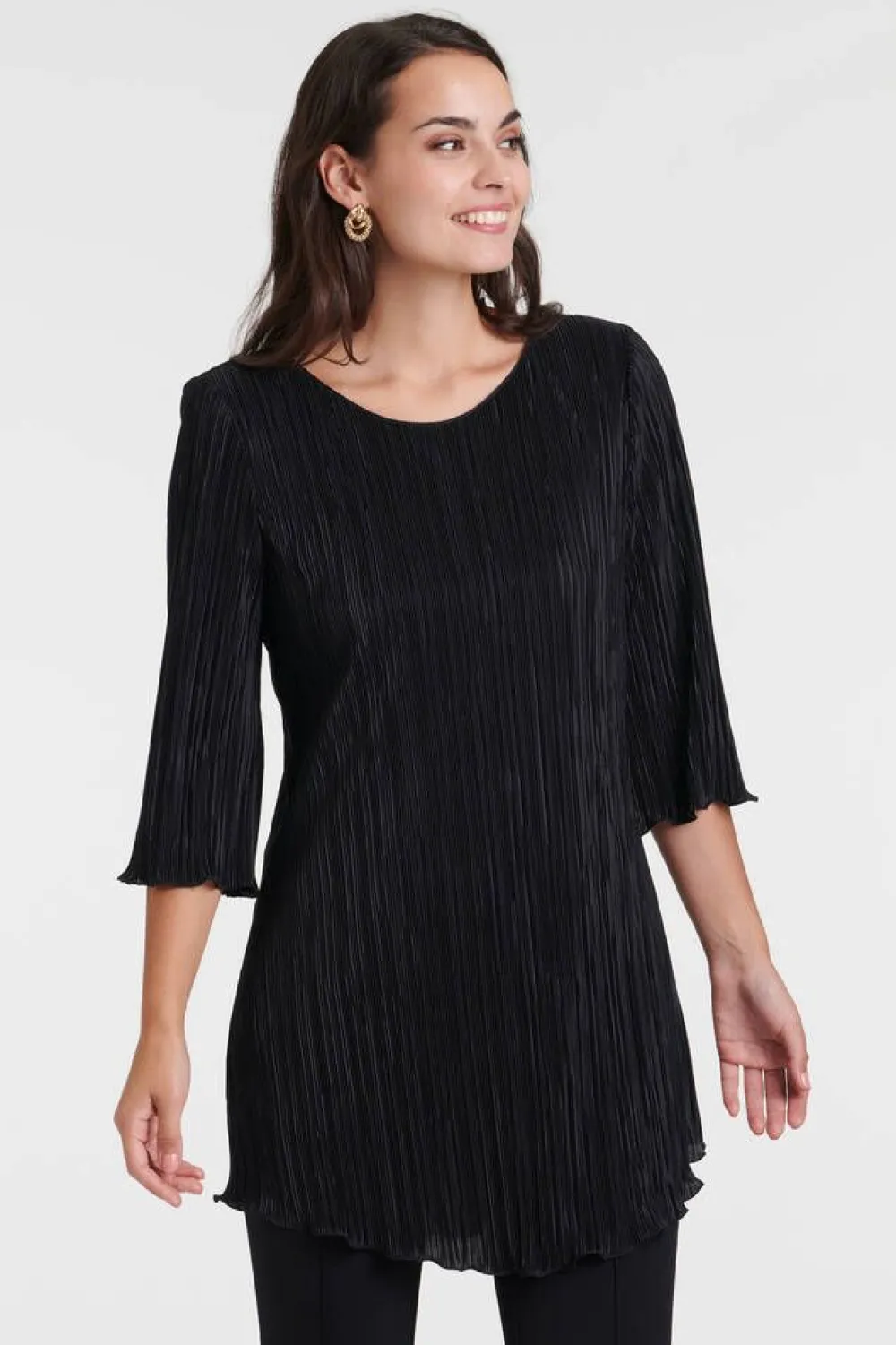 Naisten pliseerattu juhlava pusero puolipitkillä hihoilla. Pusero on pidemmän mallinen.Lisää tietojaMalli käyttää…