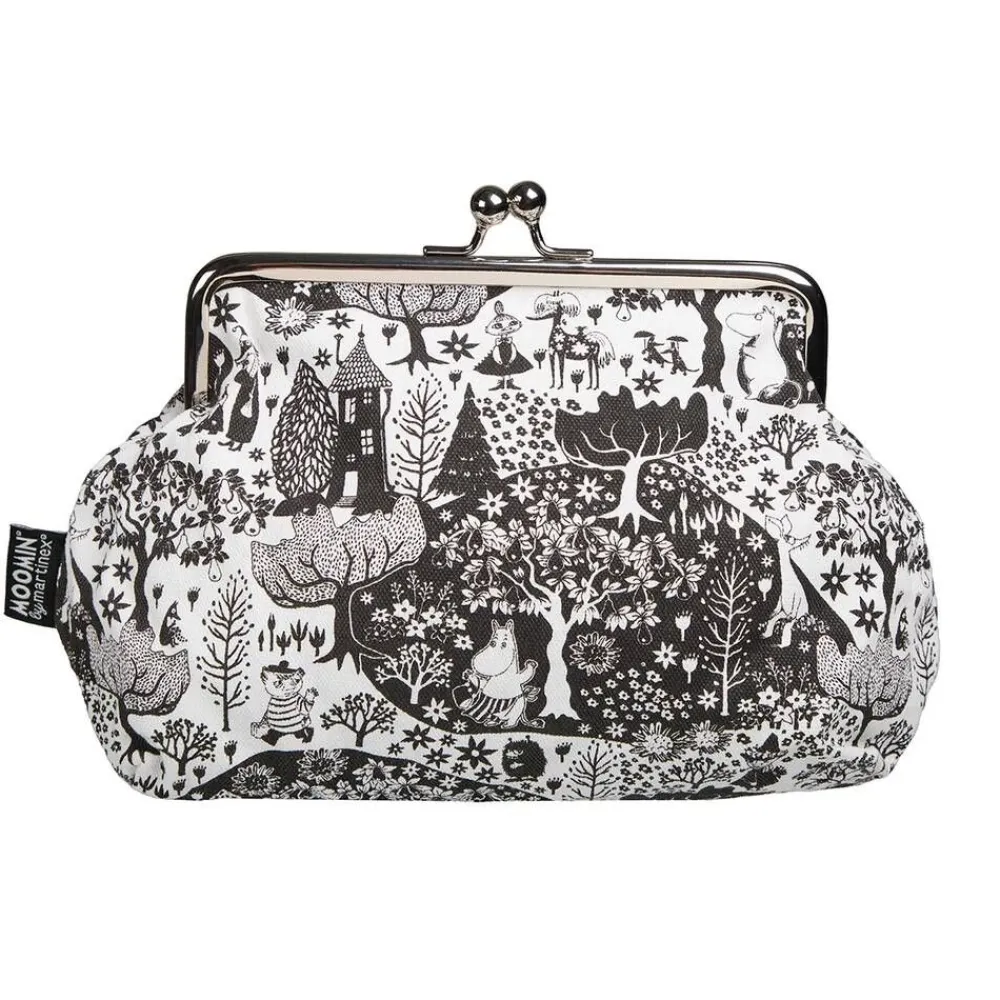 Tukevasta puuvillakankaasta valmistettu muumiaiheinen pussukka. Pussukassa on metallinen nuppilukko ja sen metalliosat o…