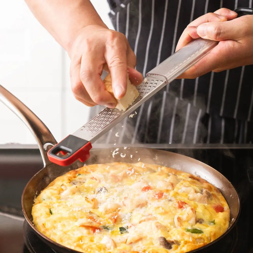| Hoito-ohjeet:Kestää konepesun astianpesukoneen ylätasolla, mutta suosittelemme käsinpesua parhaan terävyyden säilyttämiseksi. Irrota käsisuoja raastimesta pesun ajaksi. |