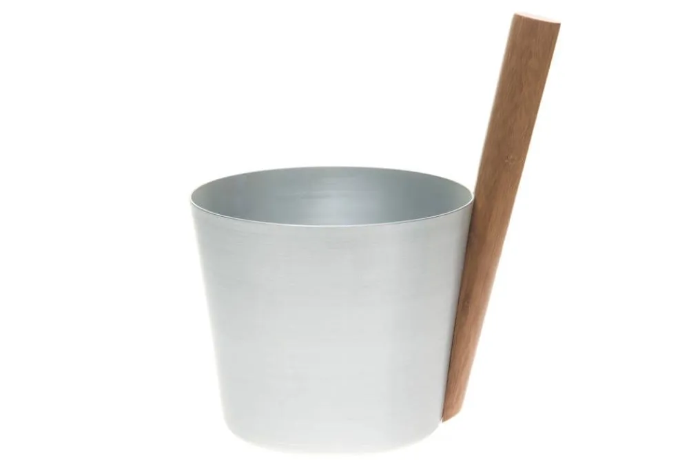 Värilliseksi anodisoitua alumiinia ja lämpökäsiteltyä bambua. Korkeus 35 cm, halkaisija 23 cm, vetoisuus 5 l.