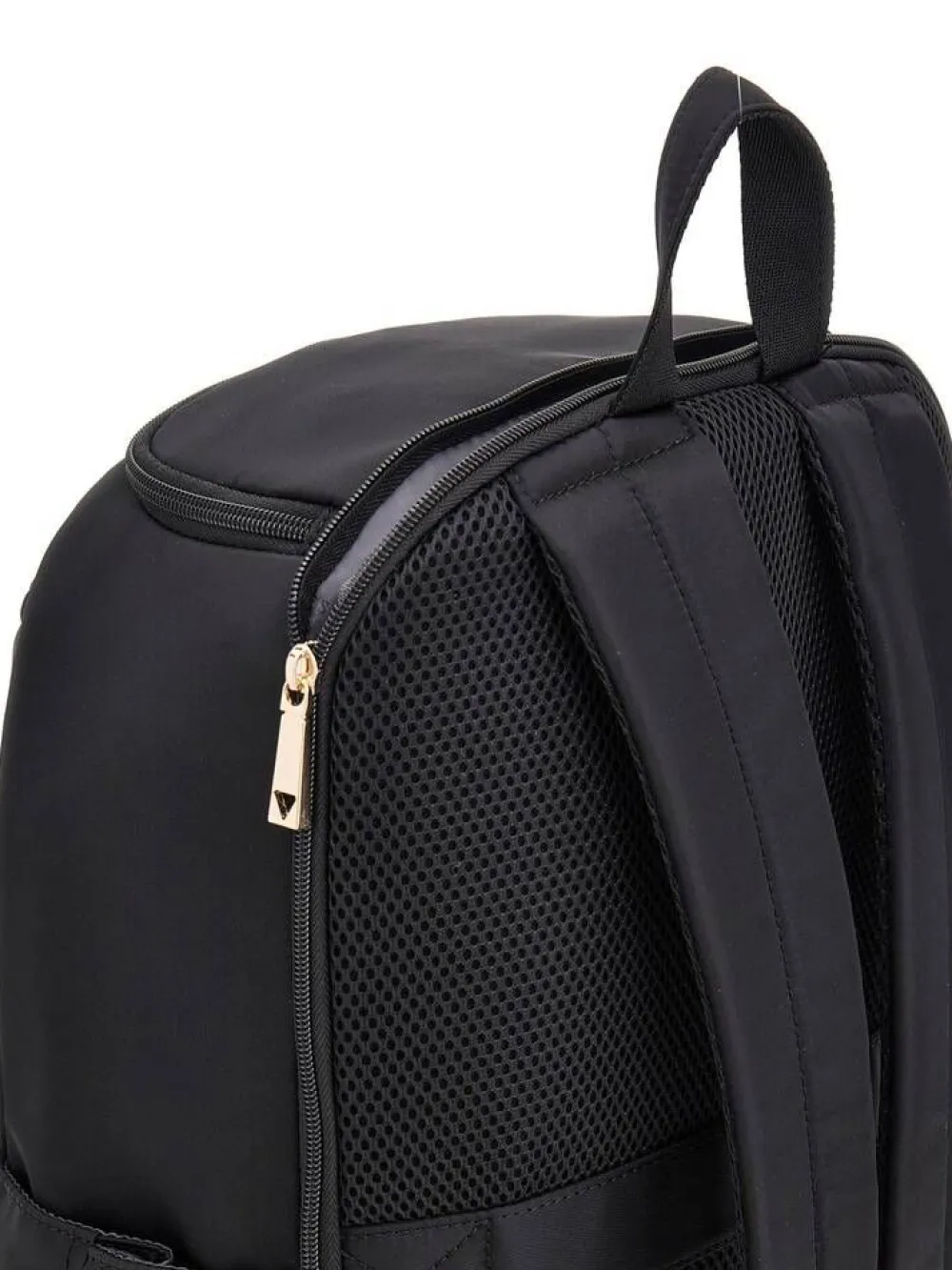 Klassisen tyylikäs reppu synteettisellä pinnalla, jossa koristeena hillitty pieni kolmiologo. Vetoketjukiinnitys ja si…