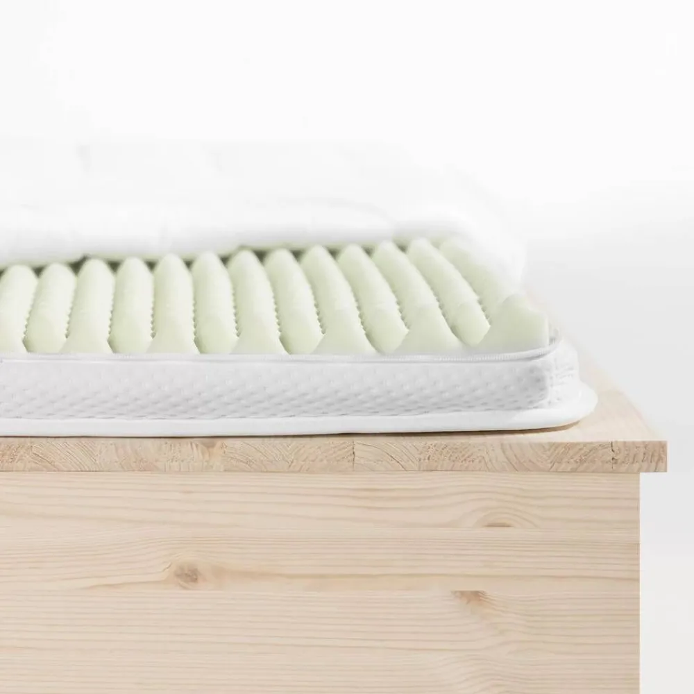 | Materiaali:Päällinen: joustavaa 100 % polyesterineulosta, vetoketju neljällä sivulla päällisen pesua varten. Täyte: toiselta puolelta profiloitua lämpöön ja painoon reagoivaa 100 % viskoelastista älypehmustetta, valmistettu polyuretaanivaahdosta. |