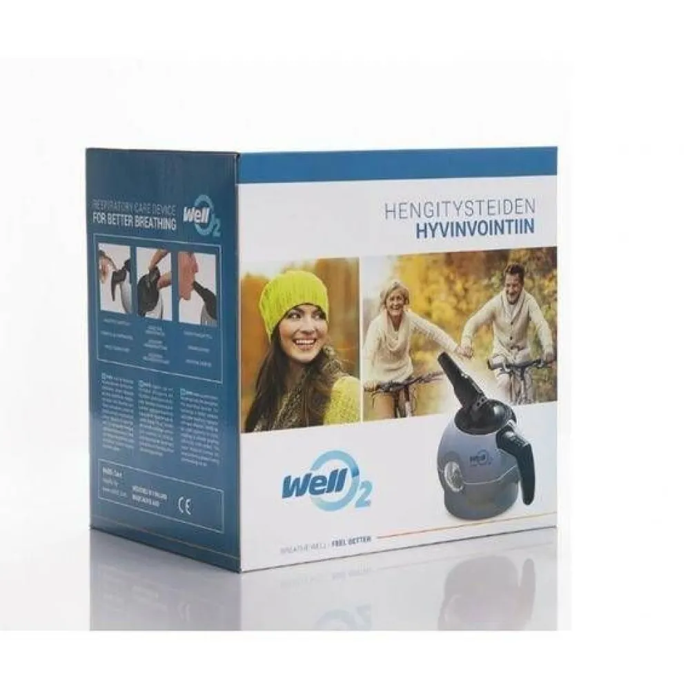 | Yhden myyntipakkauksen sisältö:WellO2-laite, virtajalusta, 3 eriväristä suukappaletta, hengityssäädin, jatkoletku, nenämaski, käyttöohjeet |