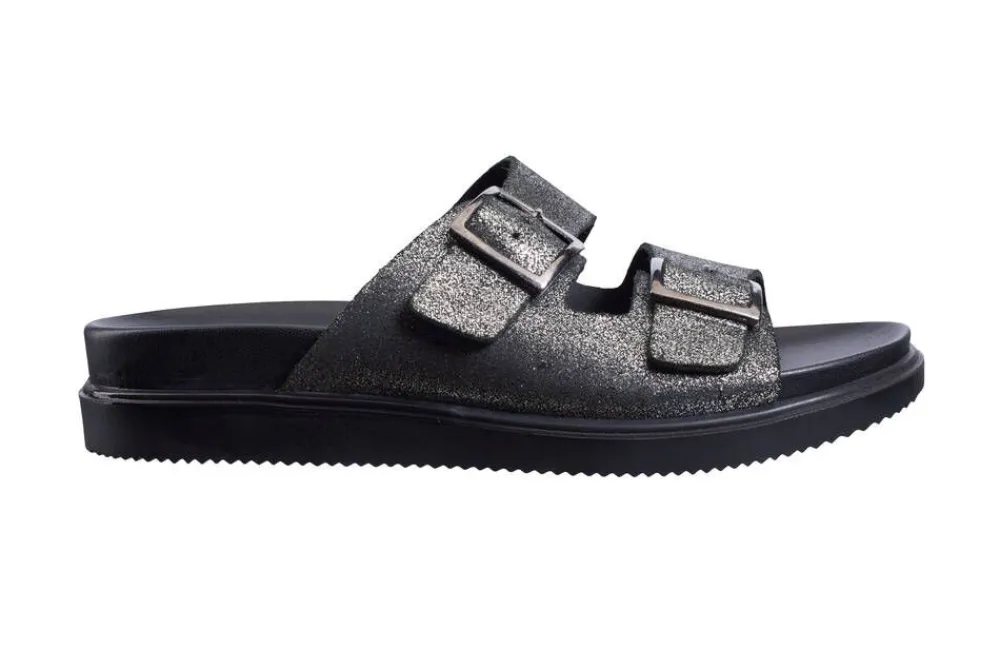 Nahkaiset sandaalit kimaltavalla pinnalla ja hopeisilla soljilla.Lisää tietojaErittäin leveä lestiUlkopohjan materia…