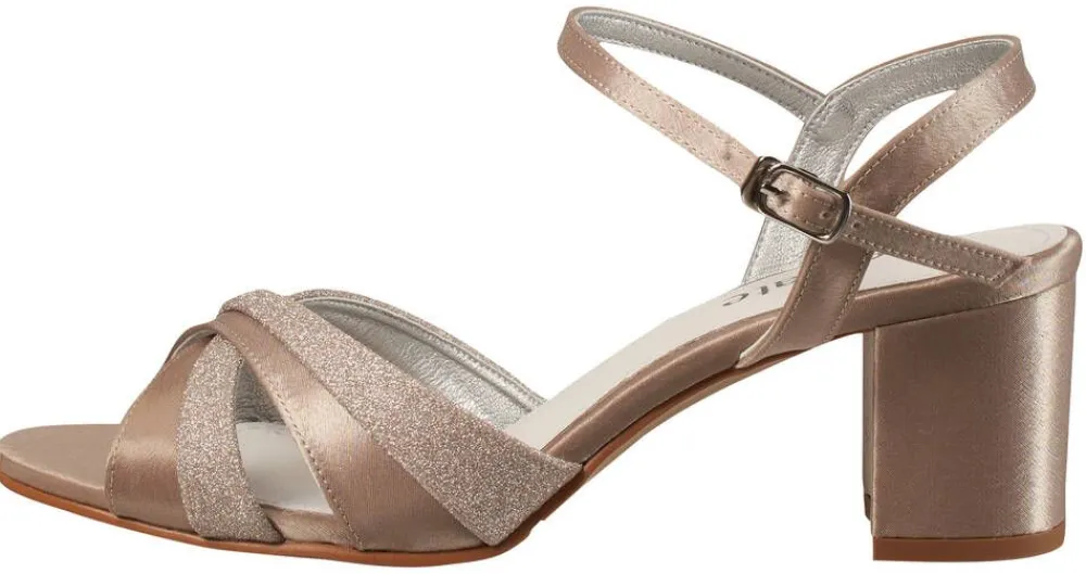 Satiiniset sandaletit glitterkoristeisilla ristiremmeillä. Kengissä on päällystetty tolppakorko. Nilkassa on sääde…