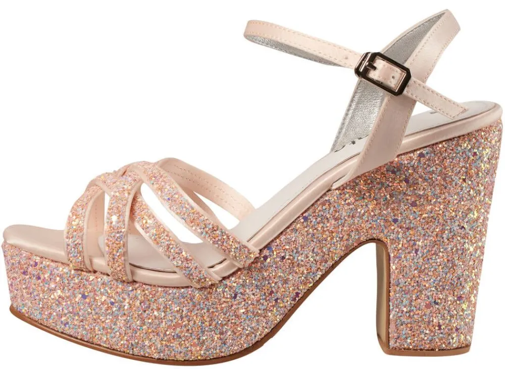 Satiinipintaiset sandaletit paksulla glitterpohjalla ja tolppakorolla. Ristiremmeissä on pohjaan sopiva glitterpinta ja…