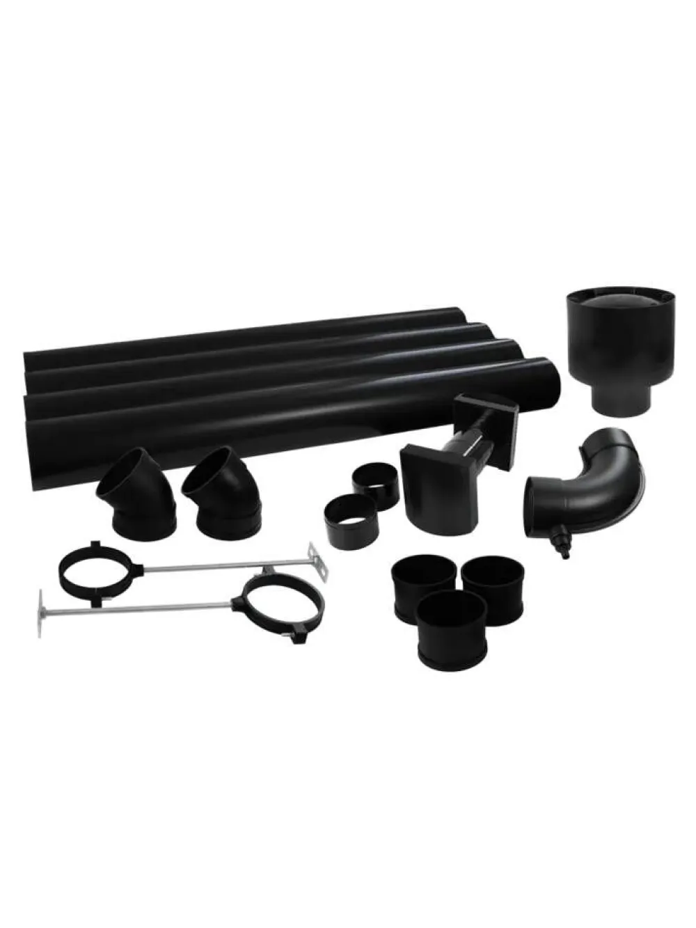 | Yhden myyntipakkauksen sisältö:4 kpl 1 m – Ø110 mm putkea. 2 kpl seinäkiinnikettä. 3 kpl suoraa liitospalaa. 2 kpl 45° liitospalaa. 1 kpl raitisilmaventtiili. 1 kpl 90° mutkaputki. 1 kpl kondenssivesiletku 90° mutkaan |
