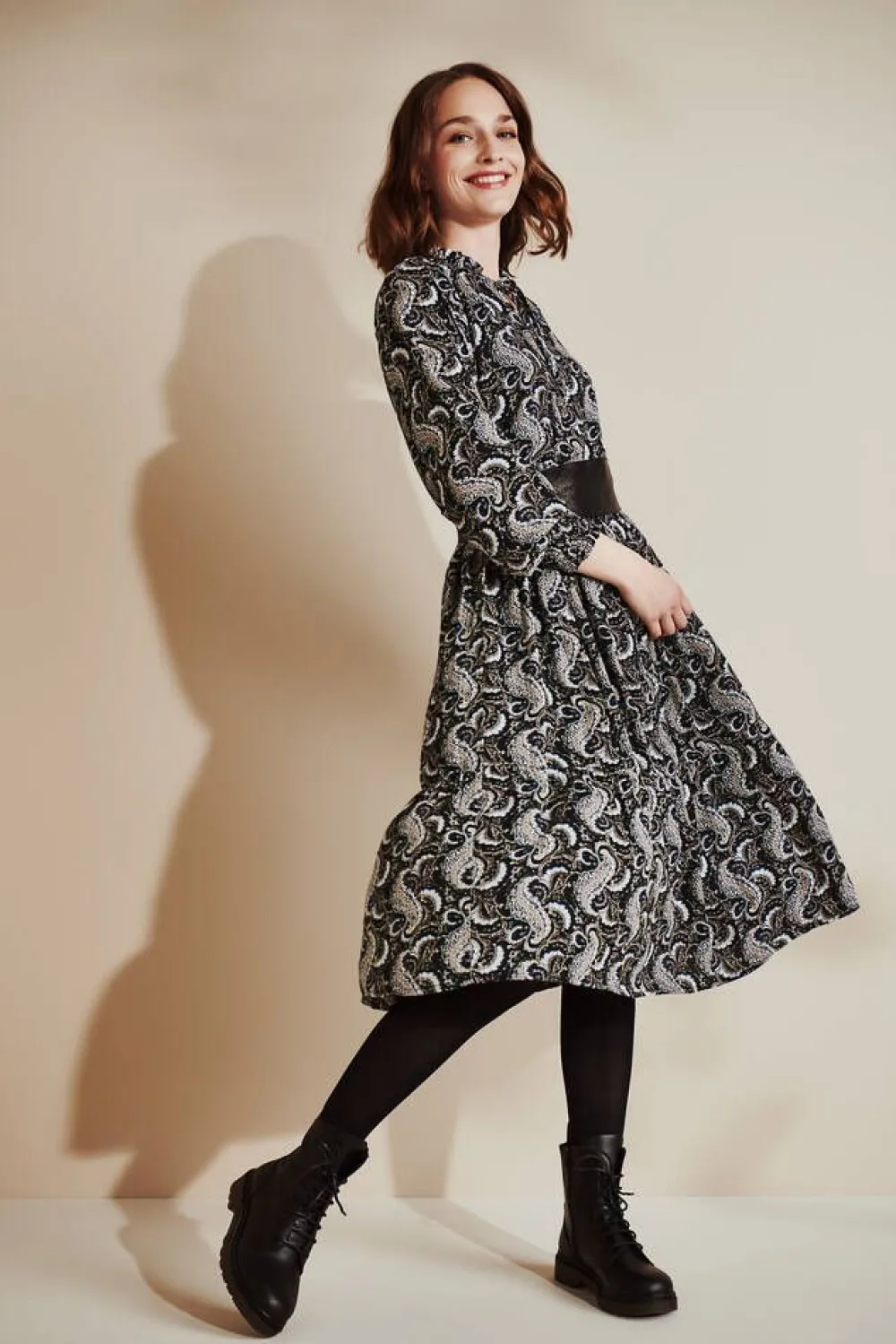 Paisley-kuosinen sifonkimekko pitkillä hihoilla. Mekon pääntiellä on solmittavat nauhat ja sisäpuolella miellyttäv…