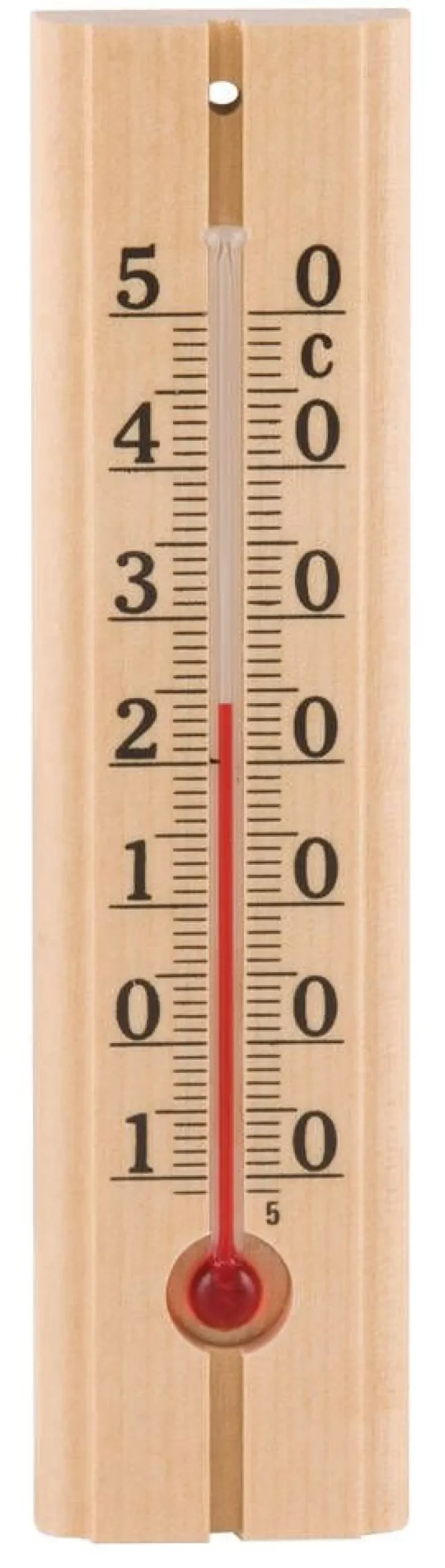 Lakatusta koivusta valmistettu huonelämpömittari mustalla asteikkopainatuksella. Mittarissa on reikä ripustusta varte…