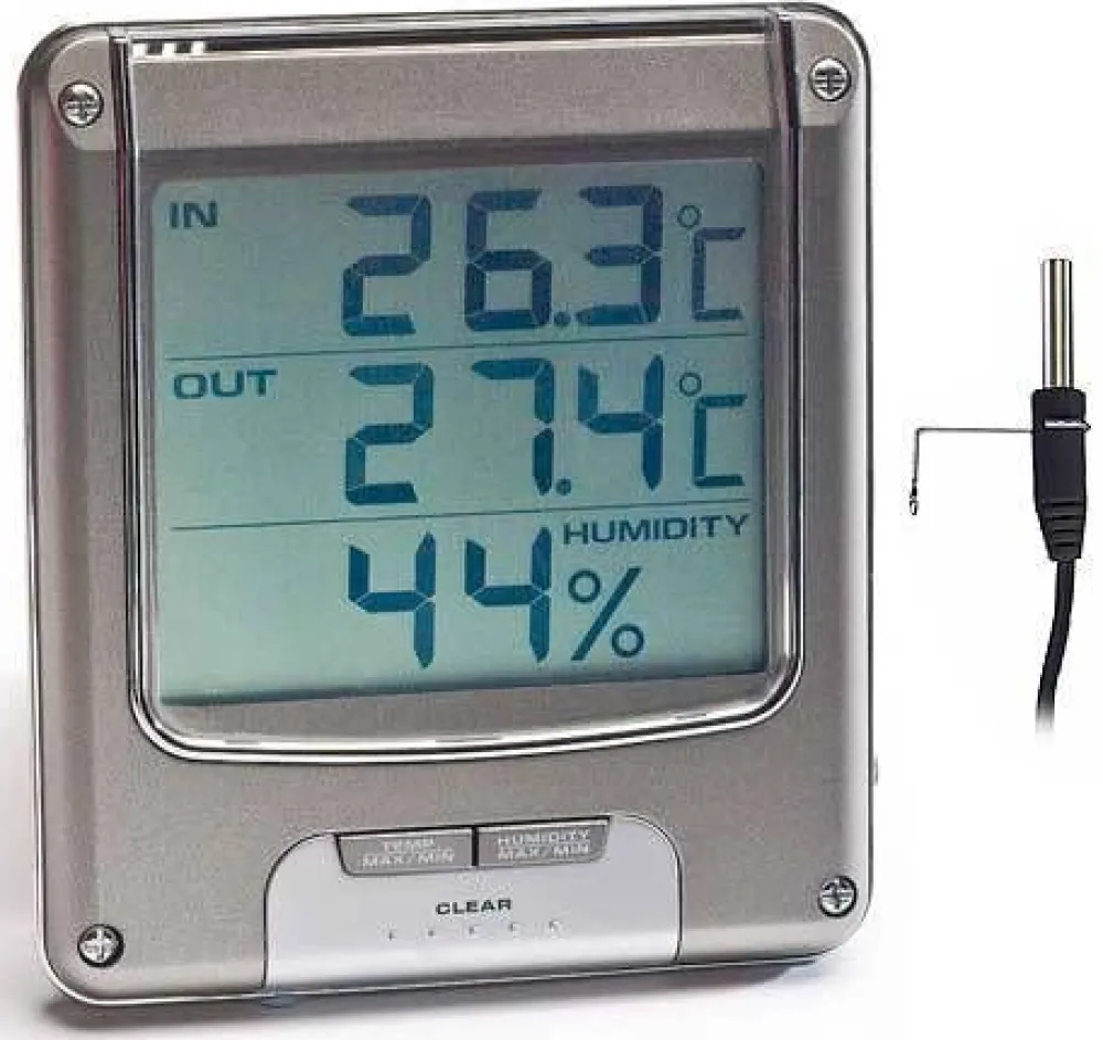 Kosteus- ja lämpömittari, joka mittaa sisäilman kosteuden sekä ulko- ja sisälämpötilat. Mittarissa on selkeät is…