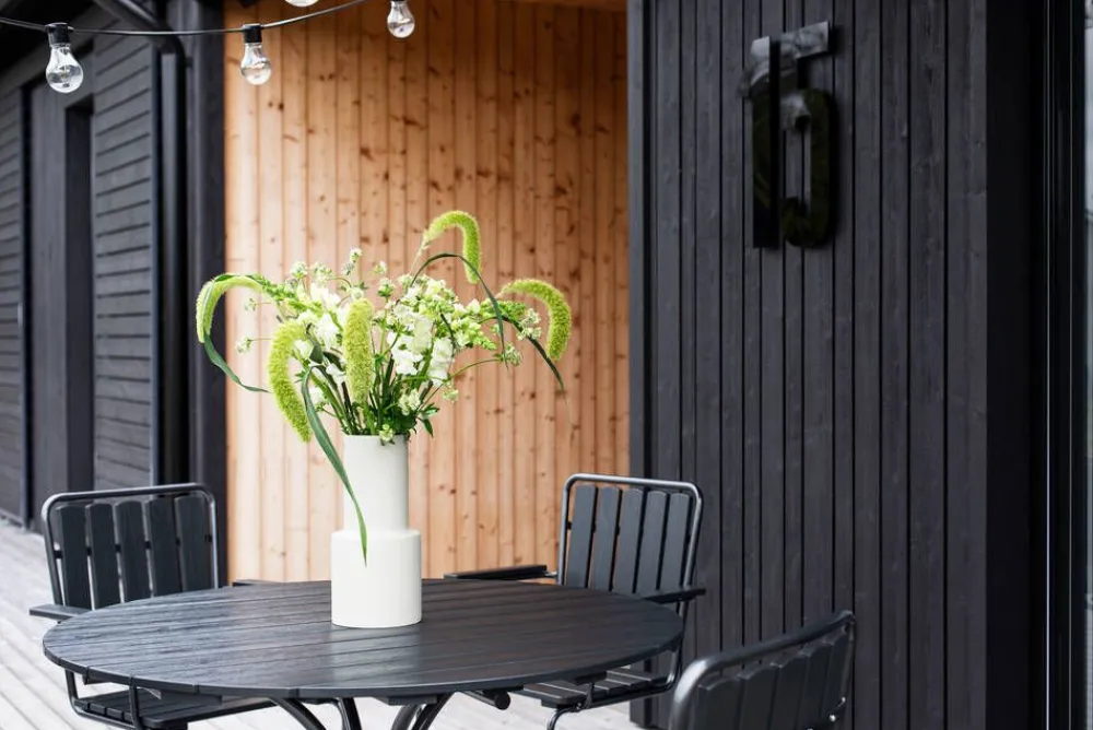 Pyöreässä 4-hengen Suvisaari-pöydässä on harmaaksi pulverimaalattu teräs runko sekä mustaksi maalatut mäntypuuo…