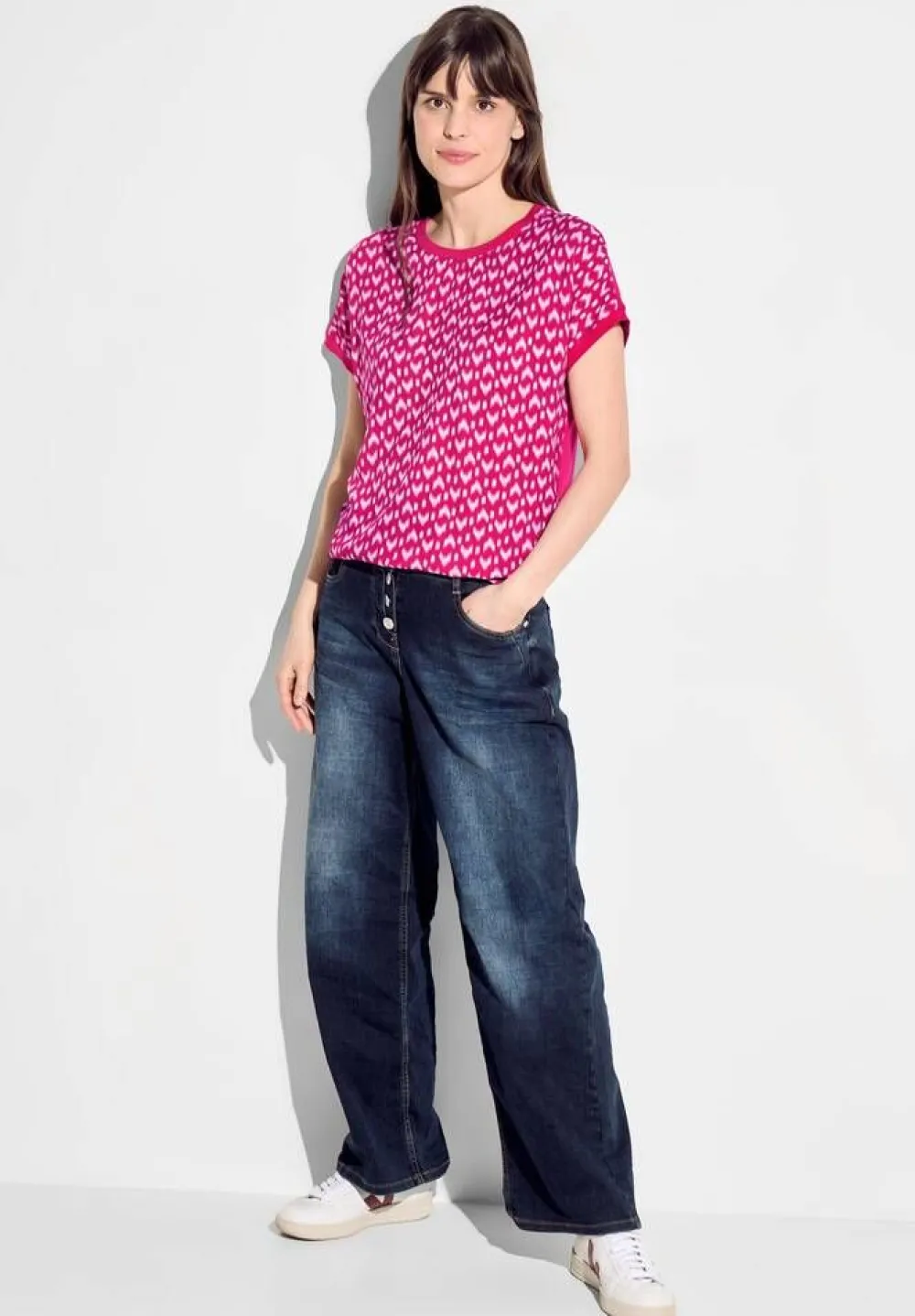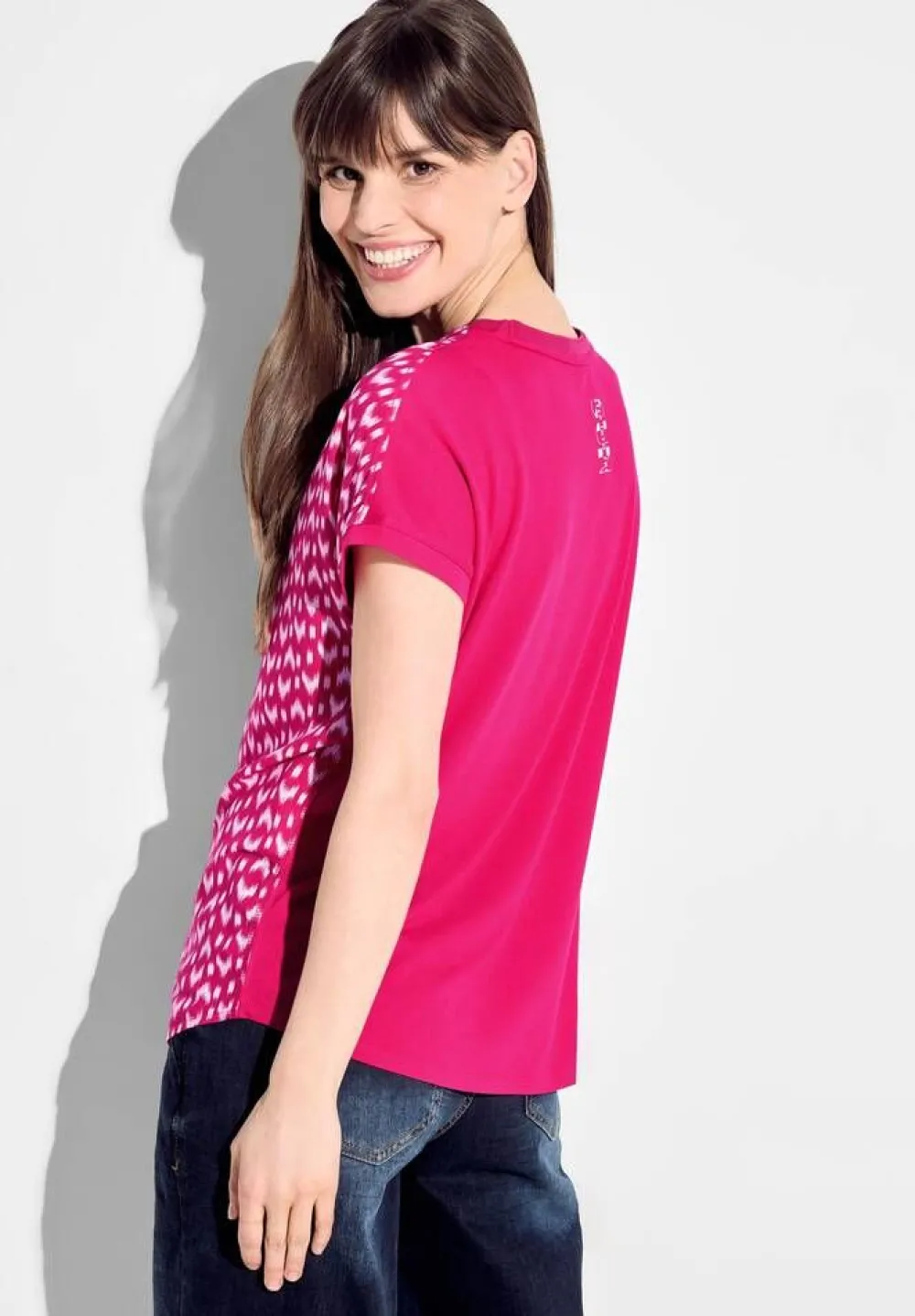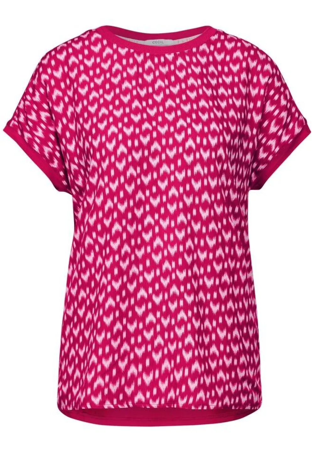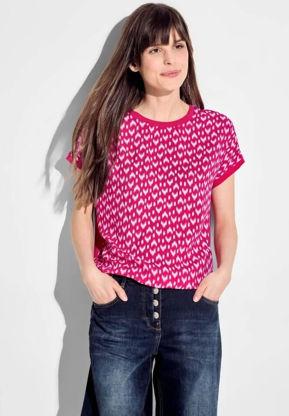 Raikas printtikuvioitu t-paita. Takaosa on yksivärinen, jossa on pieni kuvioitu yksityiskohta. Hihansuilla ja pääntie…
