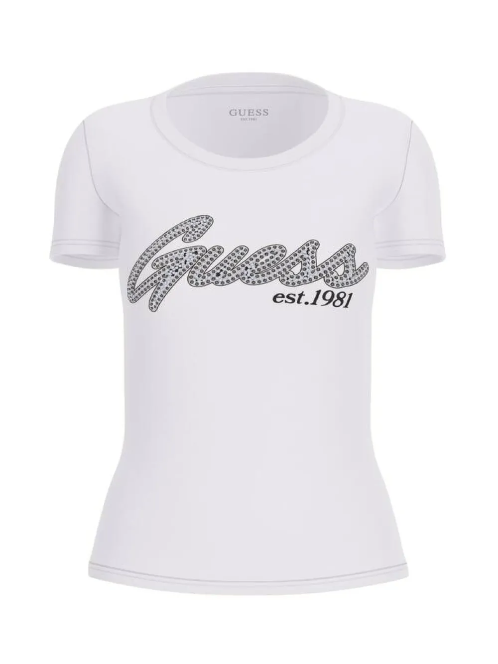 Naisellinen tyköistuva t-paita strassikoristellulla Guess-tekstillä.Lisää tietojaIstuvuus:Slim fitMateriaali:50% org…