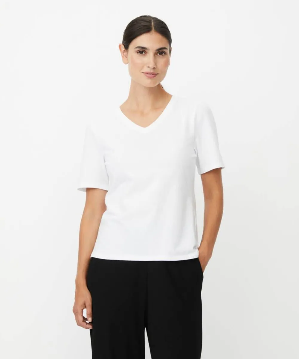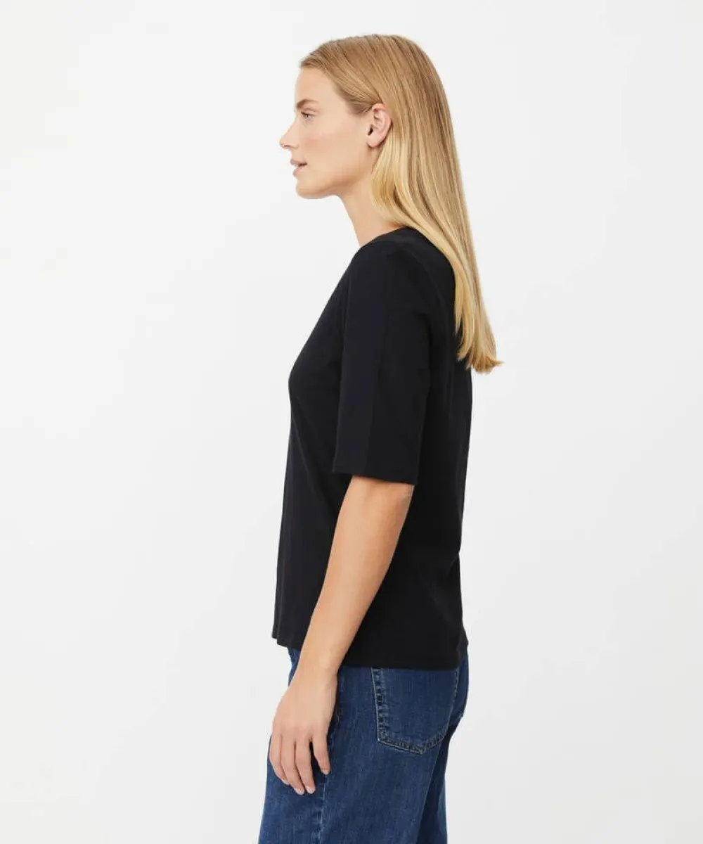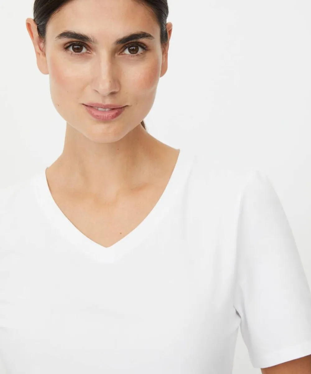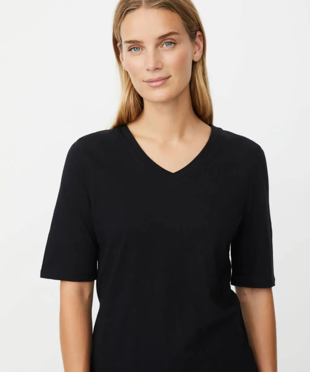 Naisten pehmeä peruspaita. V-pääntie, kyynärpituiset hihat ja kevyesti muotoiltu istuvuus tekevät tästä arjen mon…