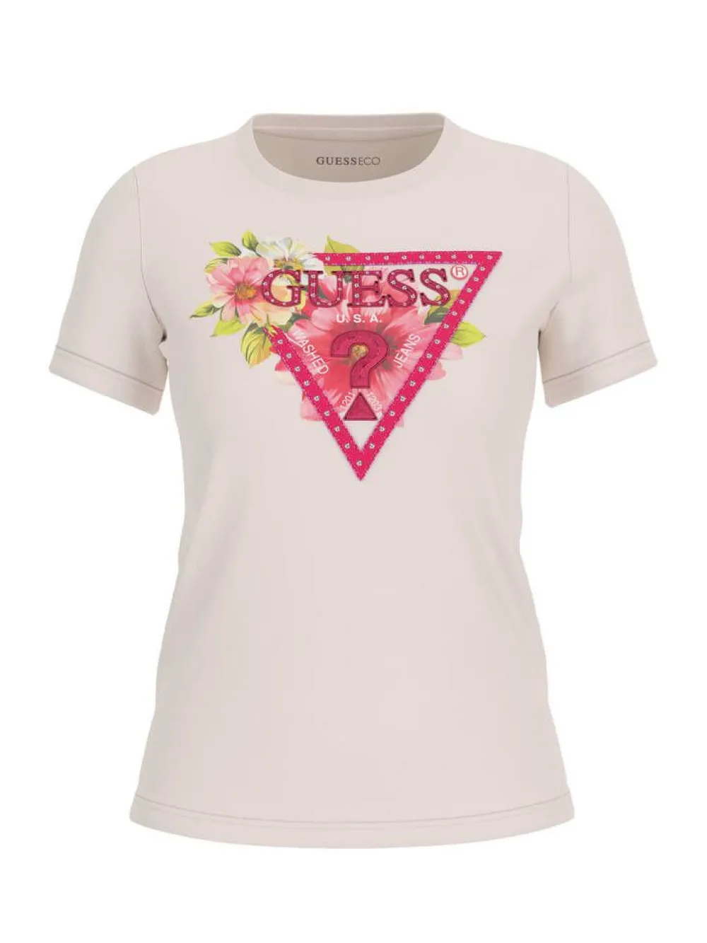 Klassinen t-paita isolla Guess-kolmioprinitillä, jossa on lisänä kesäistä kukkakuviota.Lisää tietojaMateriaali:50…