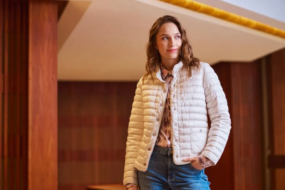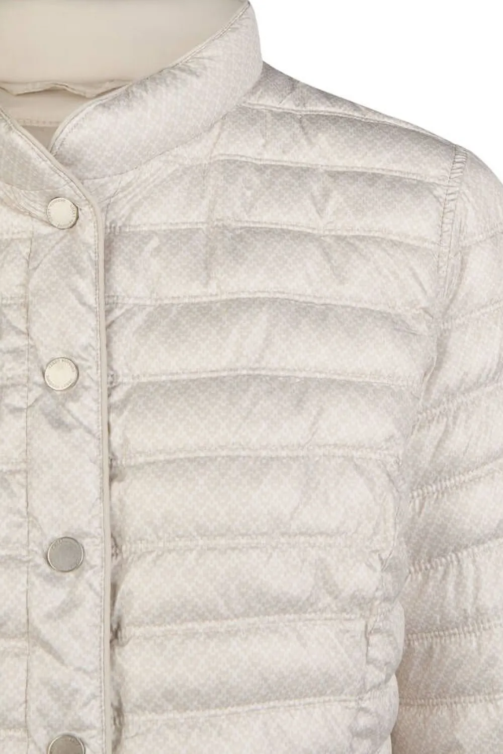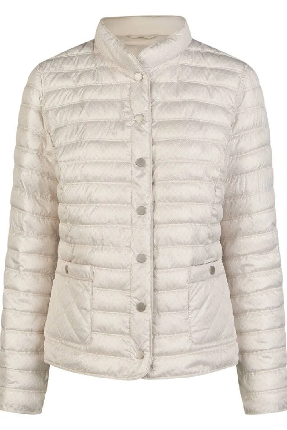 Naisellinen pystykauluksellinen kevyttoppatakki vaakaraitatikkauksilla sekä hillityllä kuosilla kauniissa luonnonvalko…