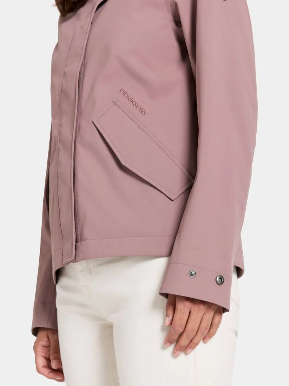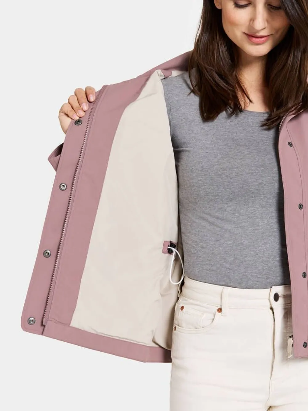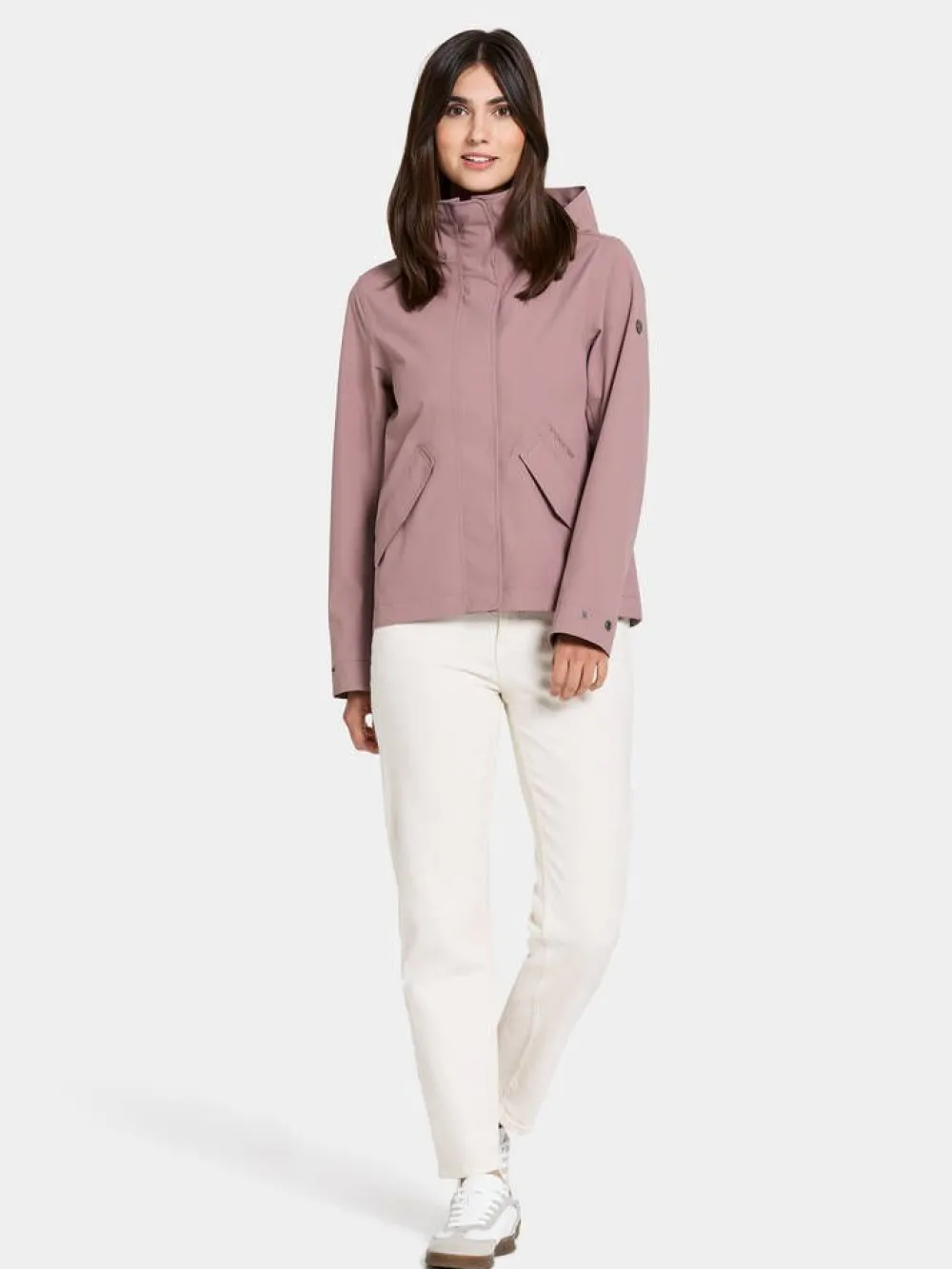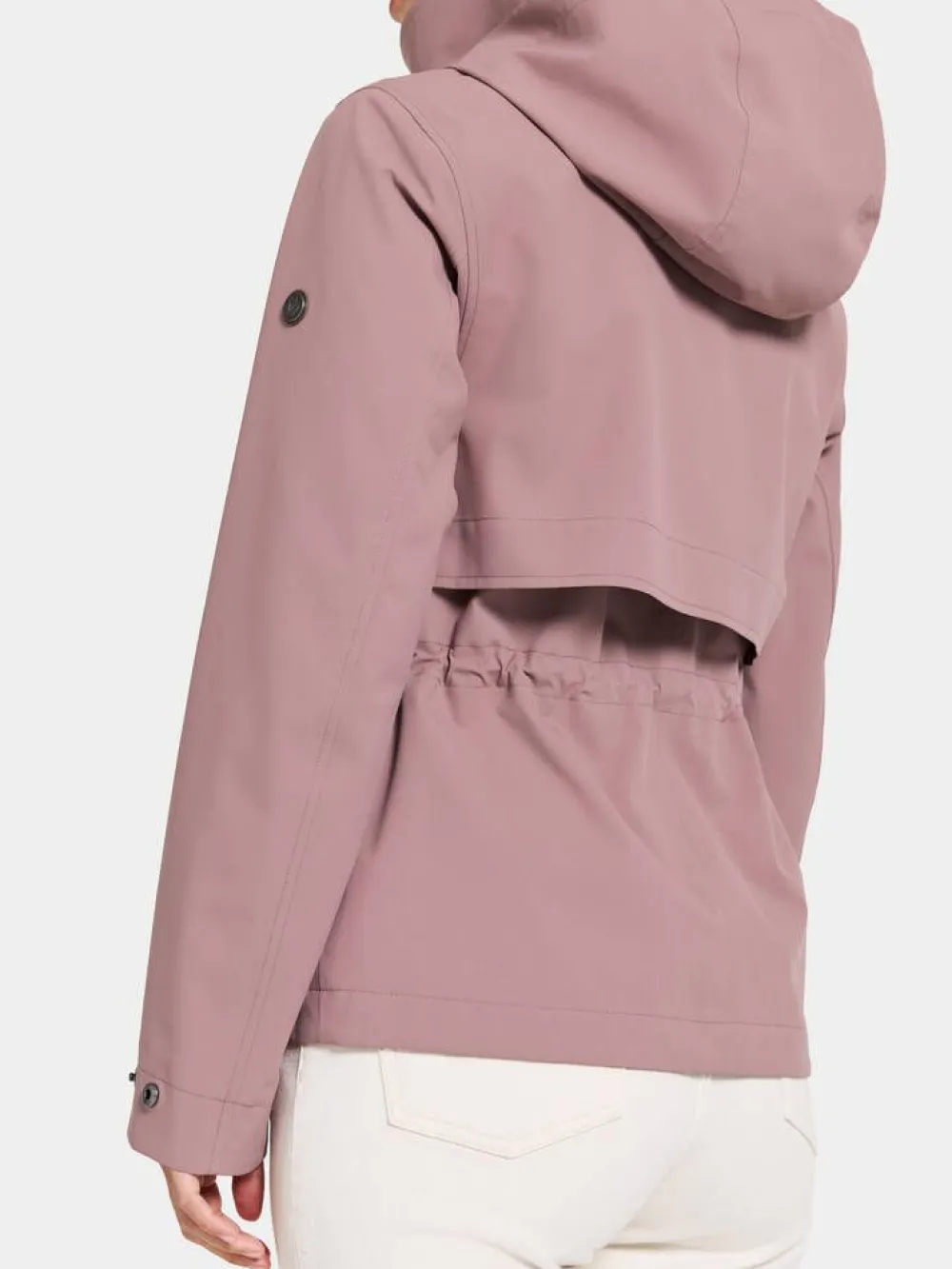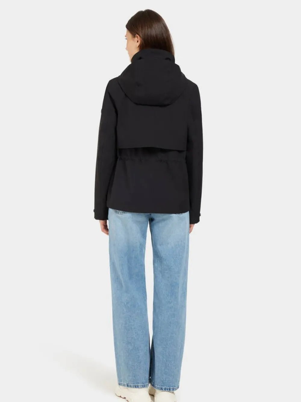 Lyhyt hupullinen jokasään takki korkealla kauluksella ja viistoläppätaskuilla. Takin sisäpuolella on vyötäröllä…