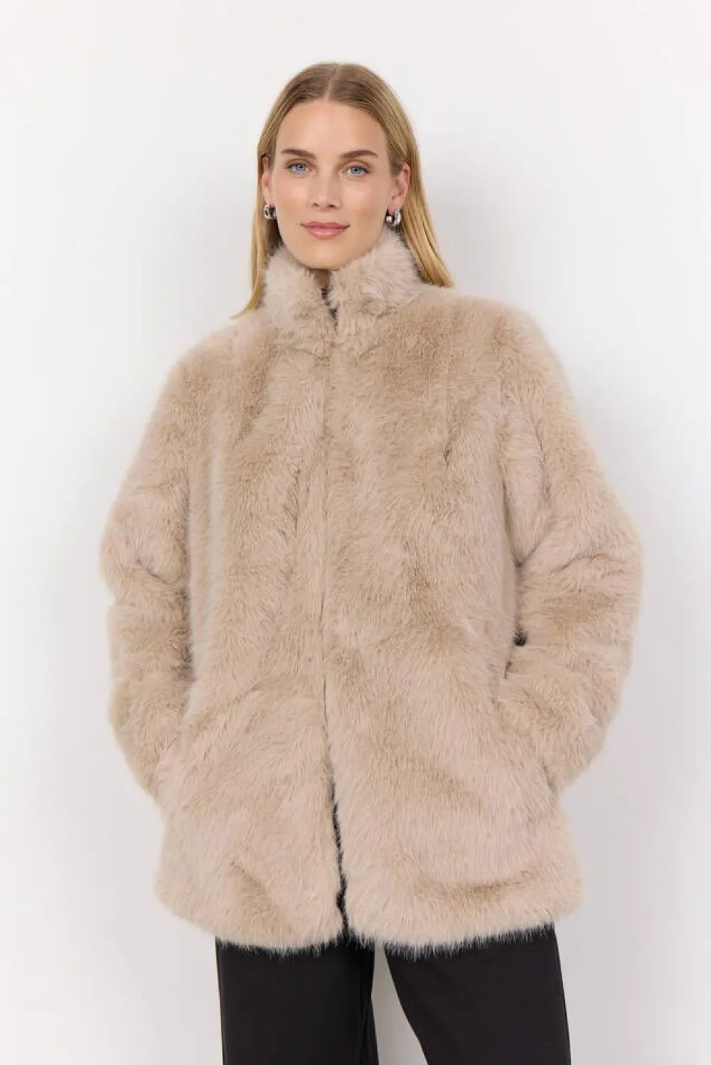 Trendikäs vaalea tekoturkistakki väljillä hihoilla ja pystykauluksella.Lisää tietojaMateriaali:100% polyesteriValmi…