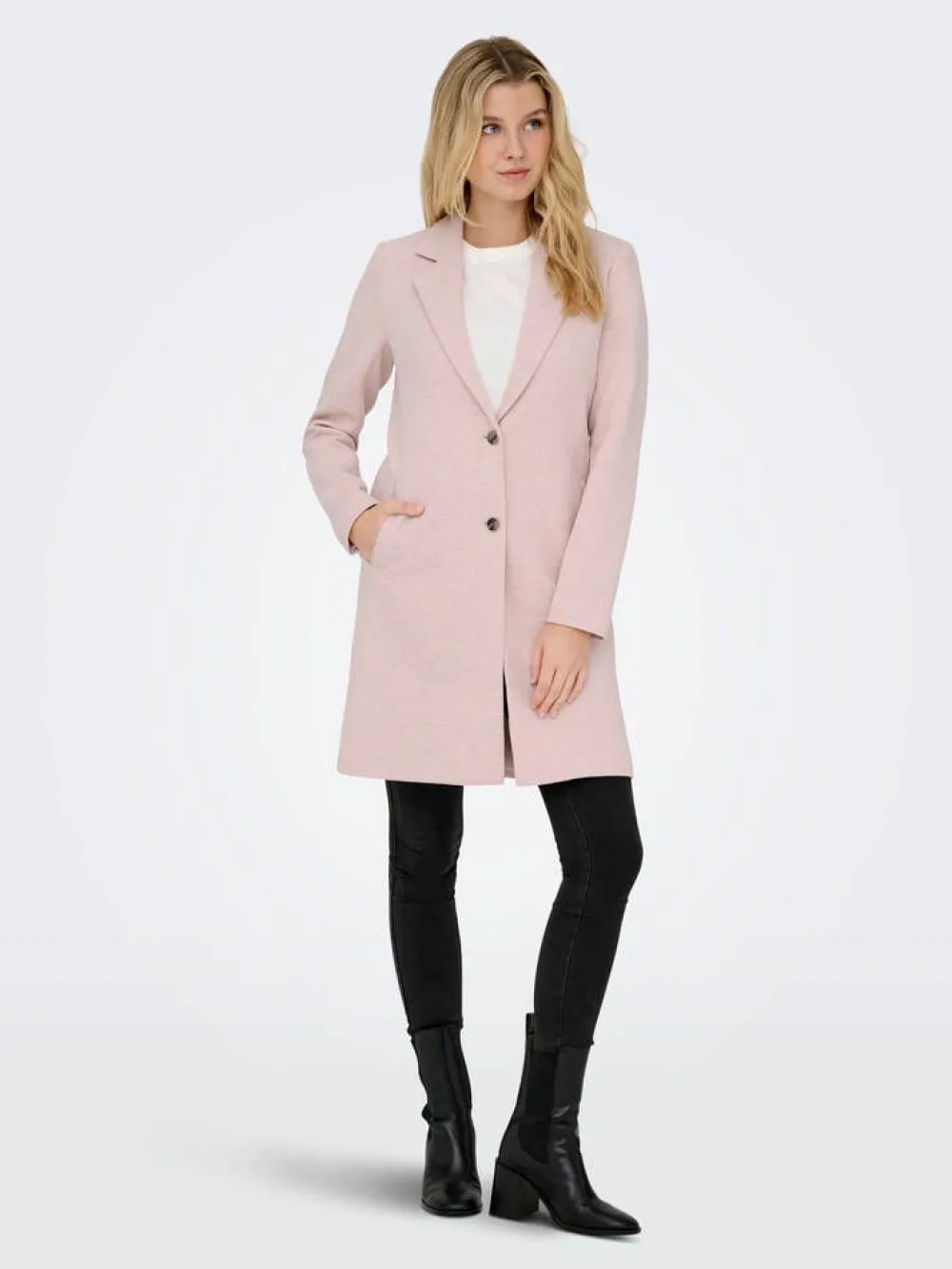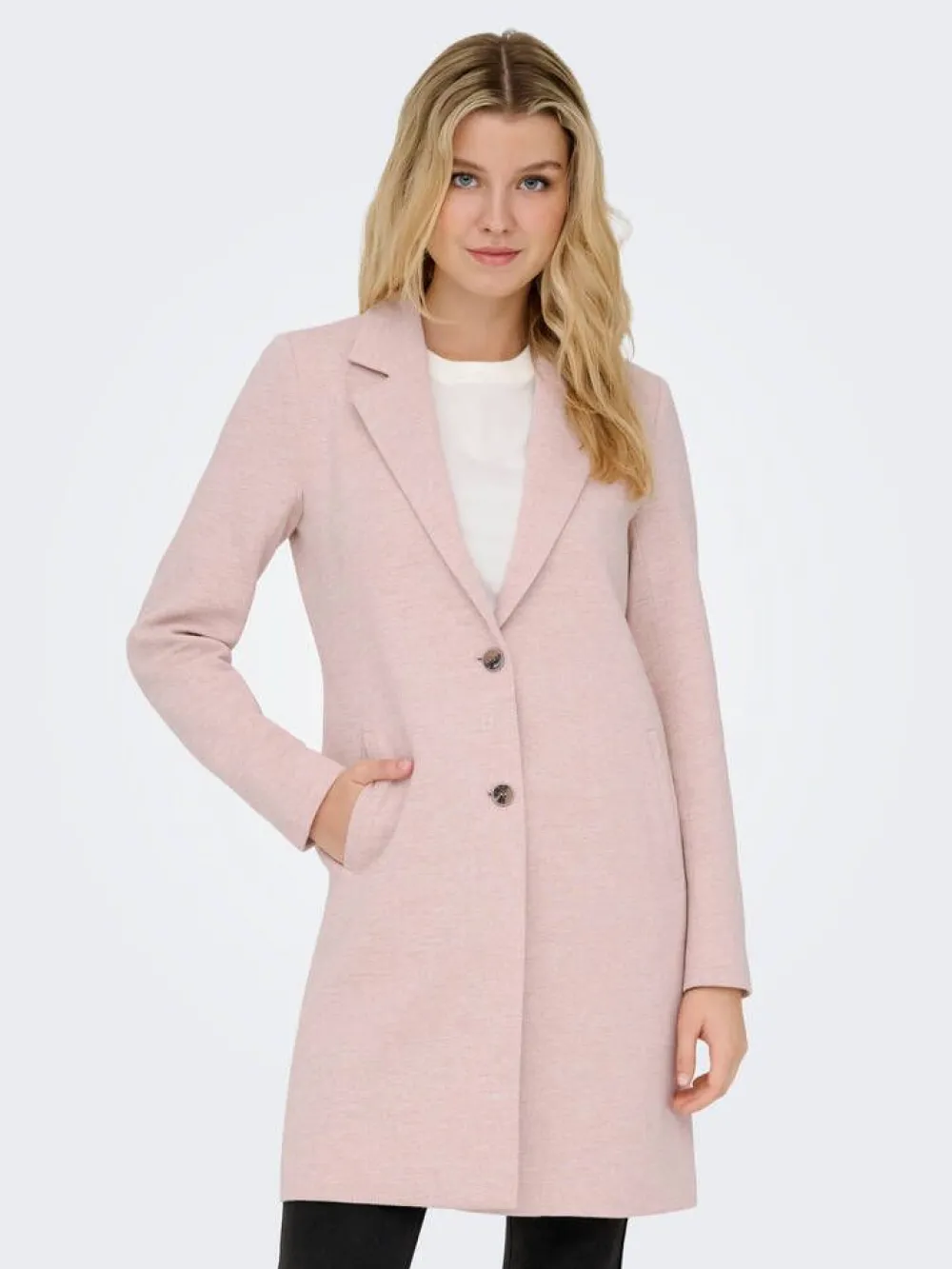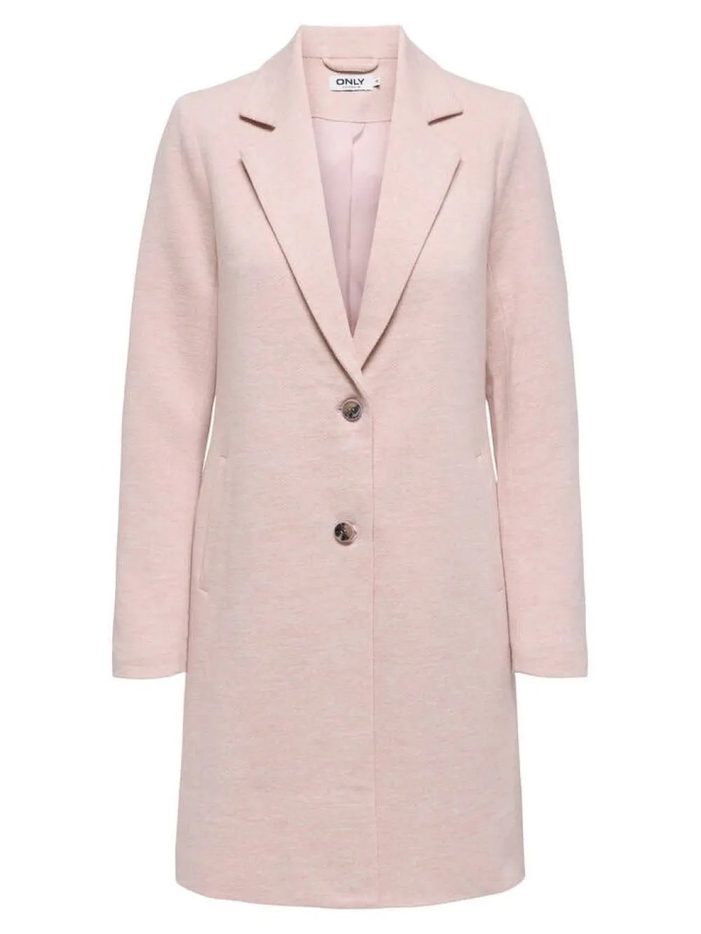 Klassisen naisellinen takki laakeilla kauluksilla ja suorilla leikkauksilla. Edessä on kaksi näyttävää nappia ja si…