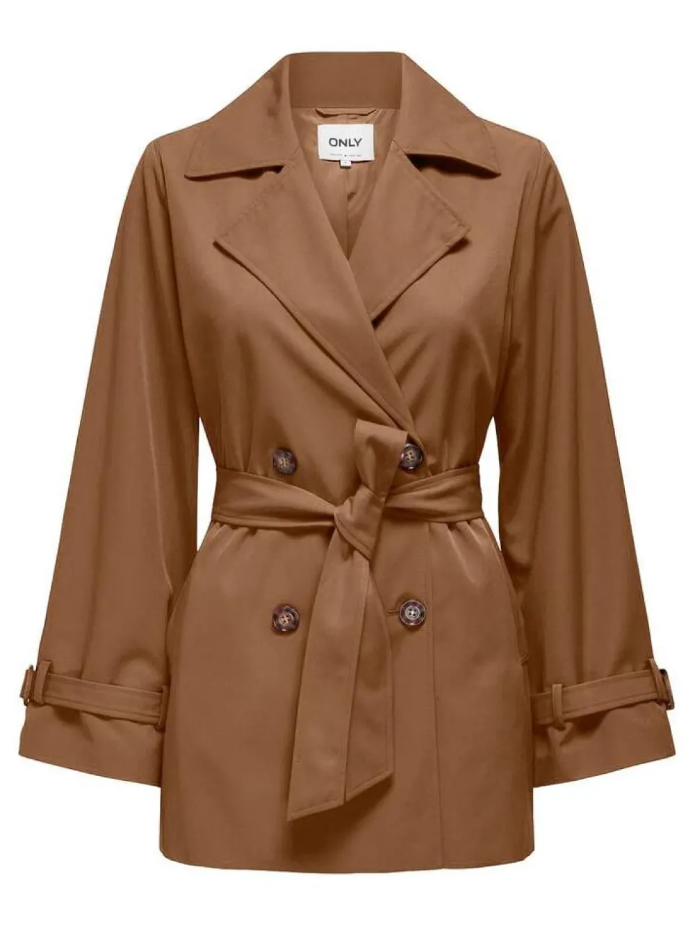 Raikkaan trendikäs lyhyt trenssitakki klassisella kaksirivisellä napituksella. Ryhdikkäät kaulukset ja solmittava vy…