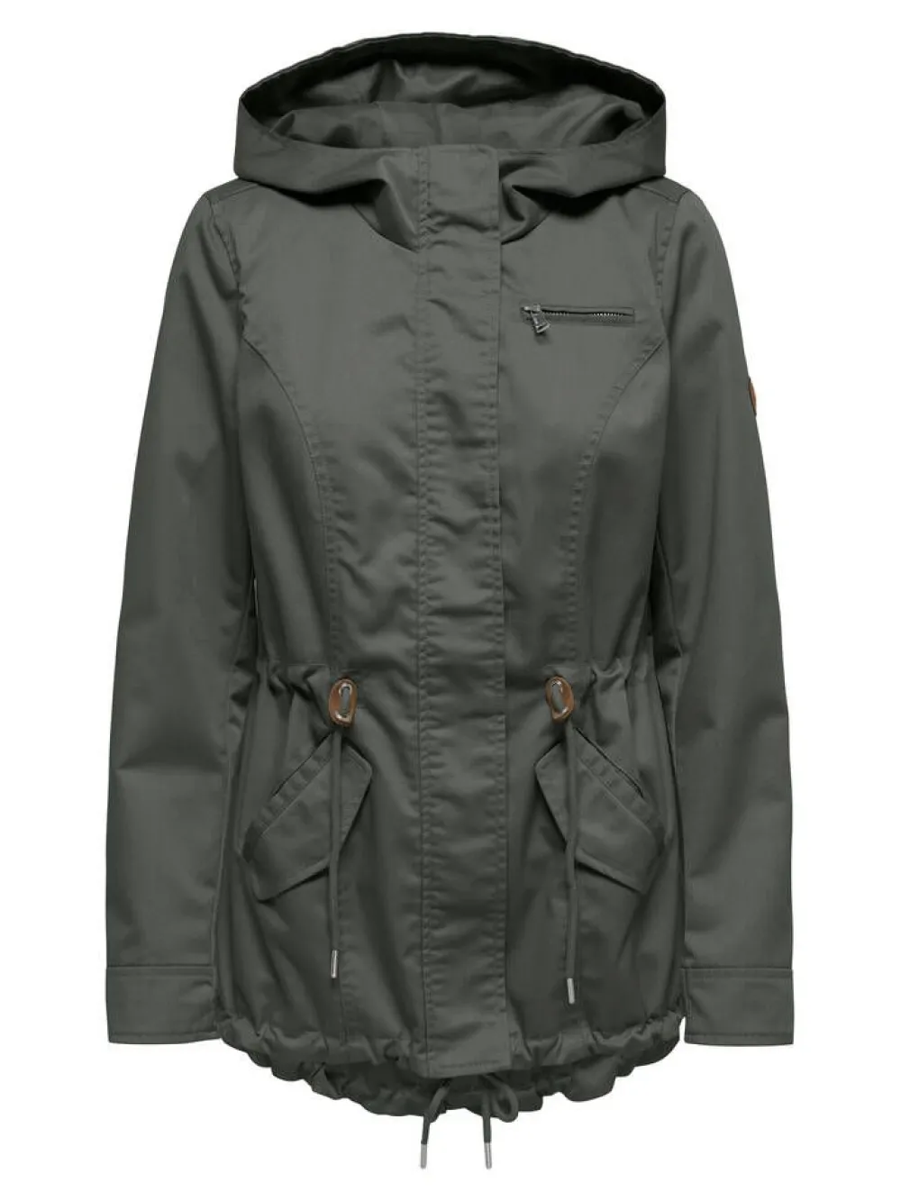 Klassinen rennon tyylikäs parkatakkimalli vyötärön kiristysnauhalla ja kiinteällä hupulla. Myös helmassa on kiris…